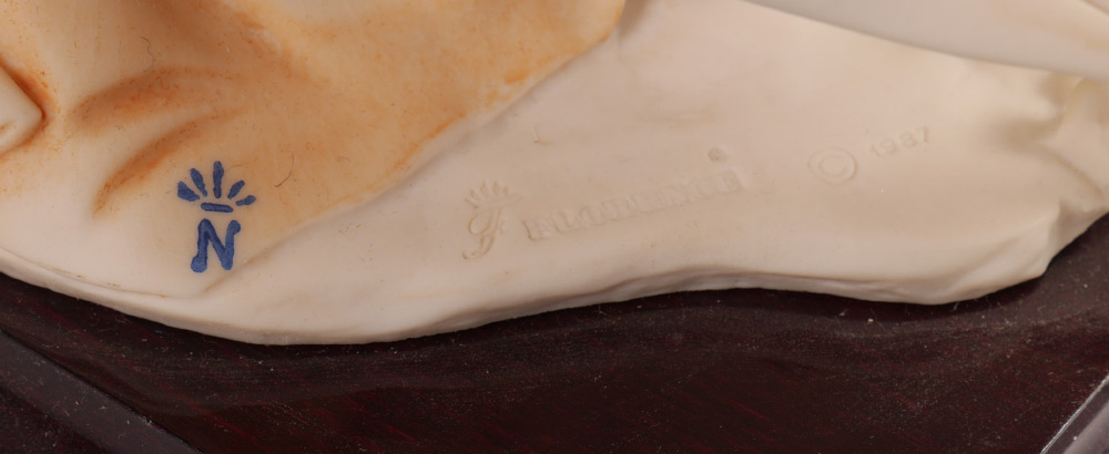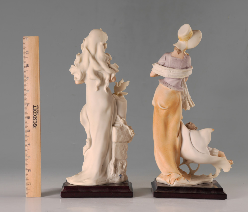 GIUSEPPE ARMANI FLORENCE SCULPTURE d'ARTE, 2 FIGURINES: 1) Lady with Doves, monochrome palette, signed and dated 1987 verso, Made in Italy sticker to front corner & two tags included, overall 13''h. x 5.5'' x 3.25''. 2) Mother with baby in pram, polychrome palette, signed and dated 1987 verso, Made in Italy sticker to front corner & two tags included, overall 13.25''h. x 6.5'' x 4.25''. Sold as a lot.