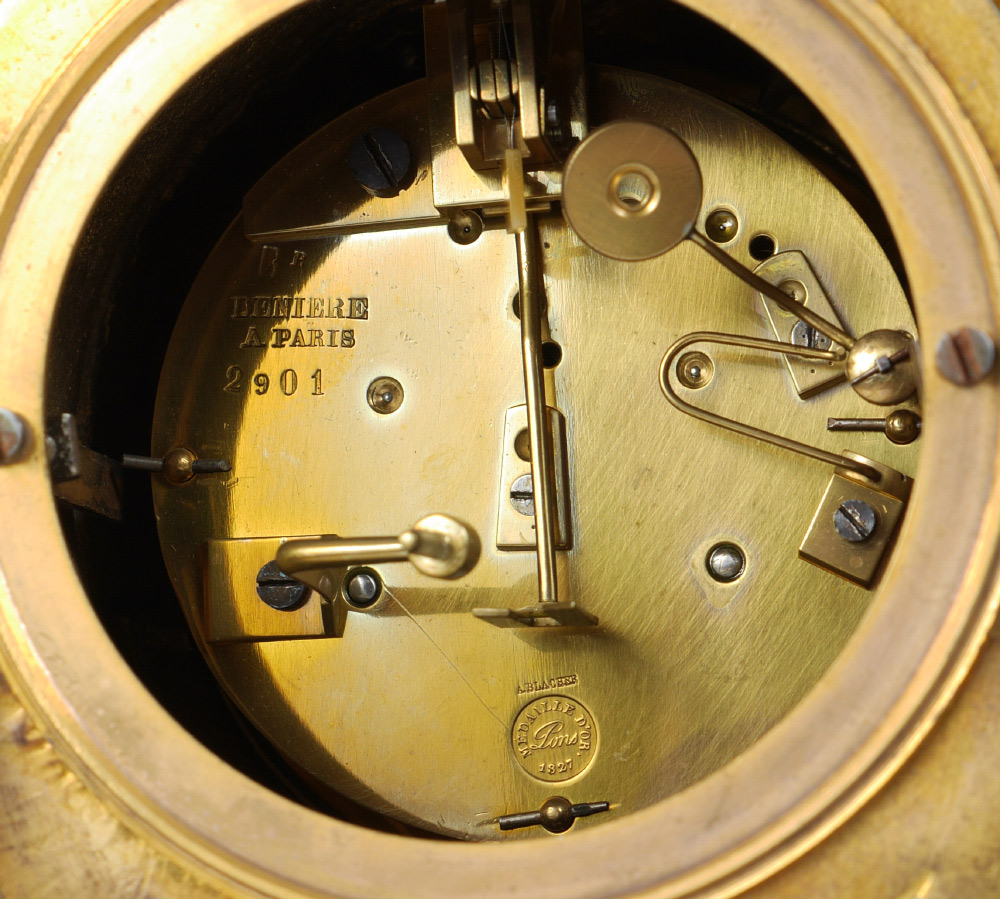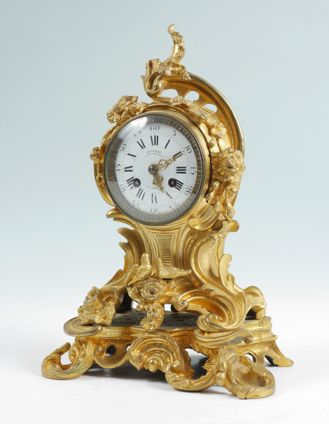 DENIERE FRENCH GILT BRONZE MANTLE CLOCK: Rococo style foliate scroll motif heavy gilt bronze motif, enamel dial marked ''Deniere Ft De Bronzes A Paris''. French time and strike movement also marked Deniere A Paris with matching serial numbers on movement and original pendulum 2901.