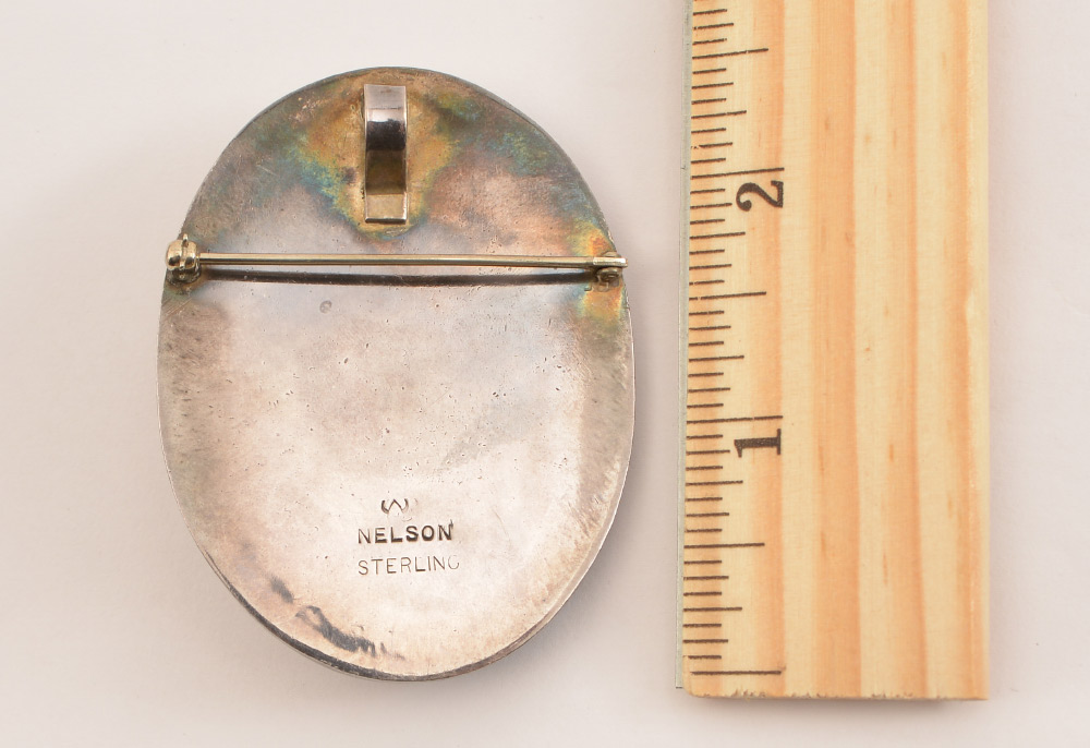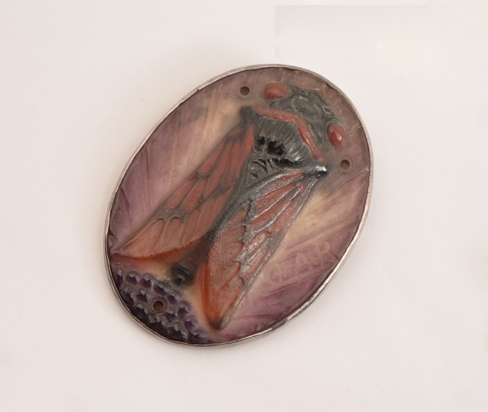 G. ARGY ROUSSEAU PATE-DE-VERRE CICADA PENDANT: Purple pate-de-verre pendant converted to a pin with sterling pin back and loop for chain. Signed G.A.R., measures 2 1/2'' x 2''.