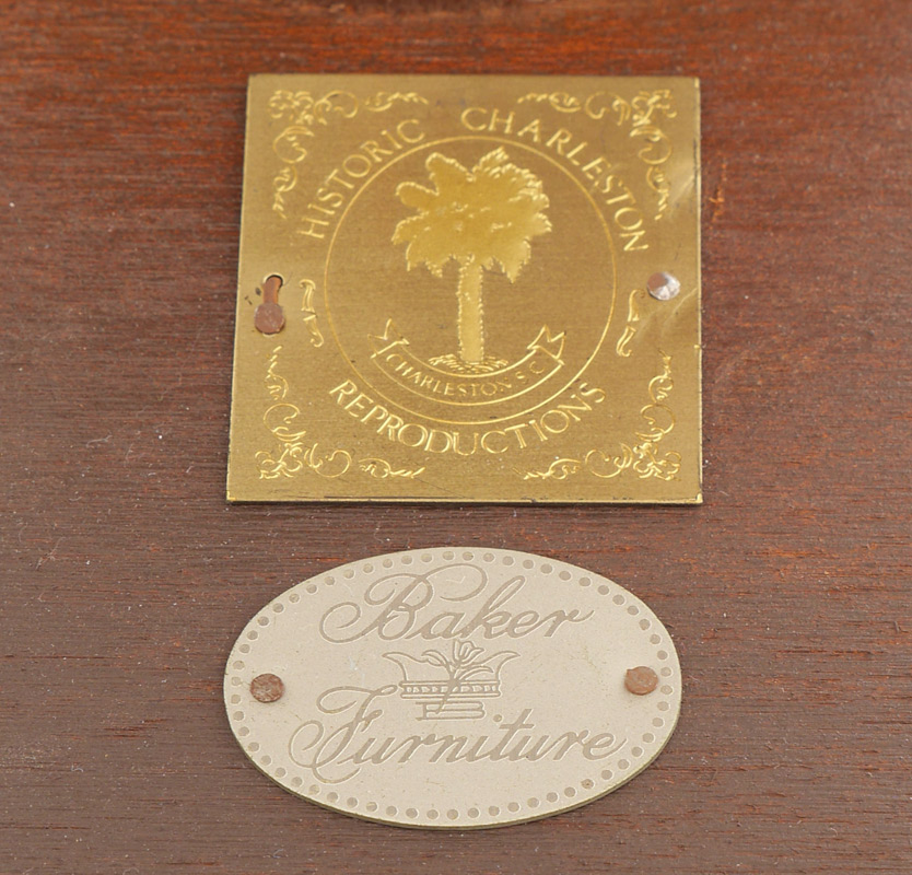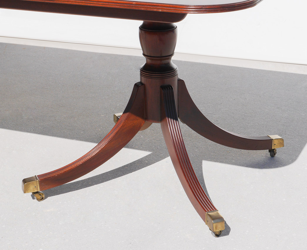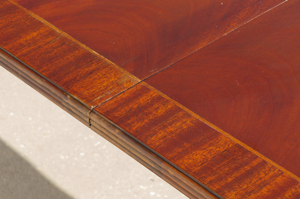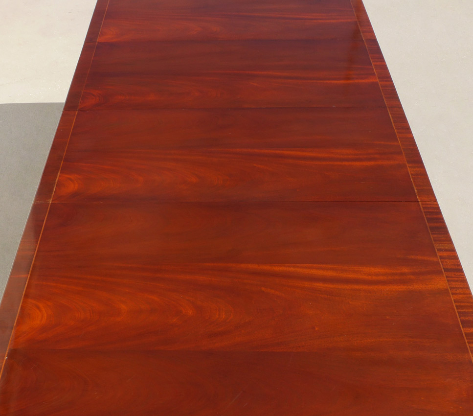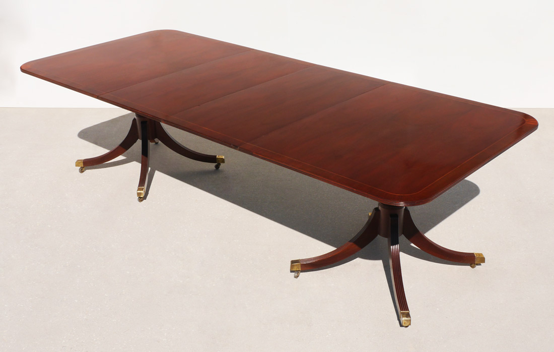 BAKER HISTORIC CHARLESTON BANDED MAHOGANY DINING TABLE: Banded mahogany top, double pedestal base with fluted splayed legs ending in brass caps and castors, Baker metal tags. 29 3/4'' h. x 68 1/4'' x 46'', the two leaves measures 20''.