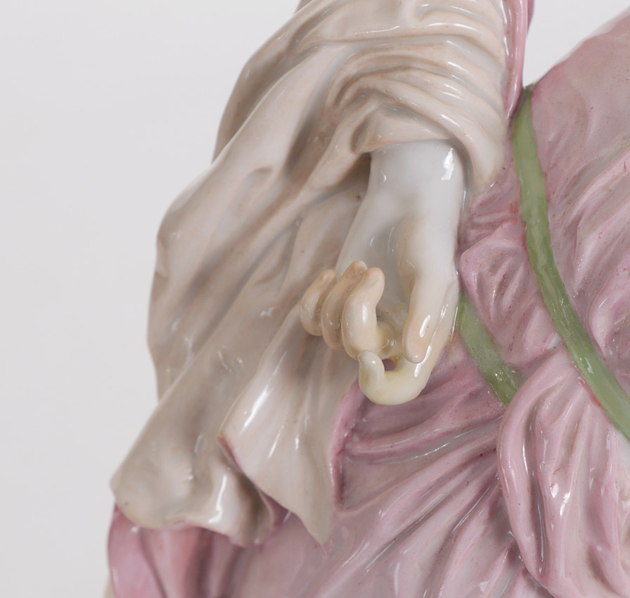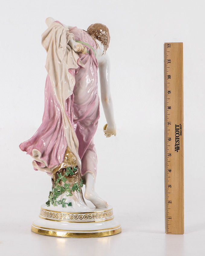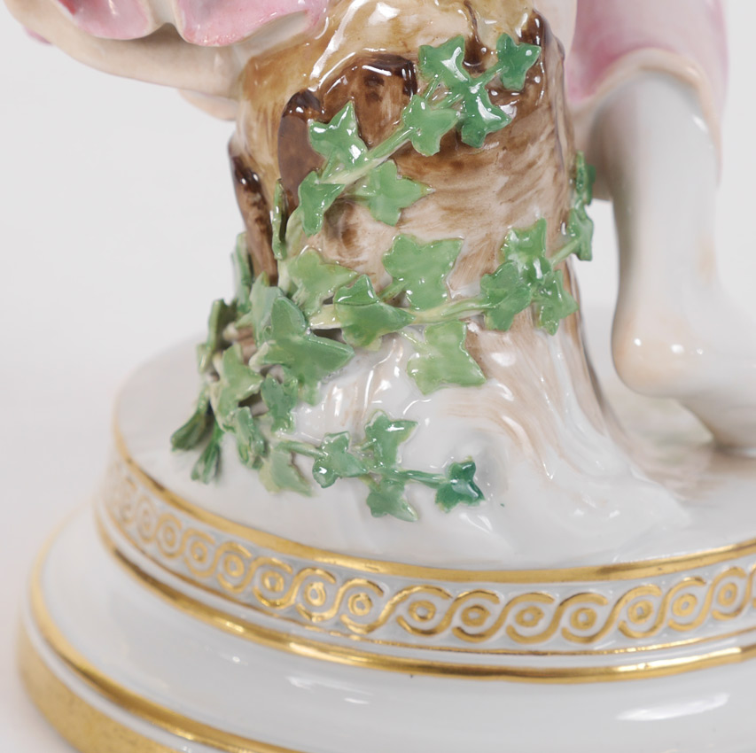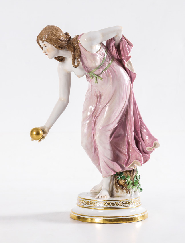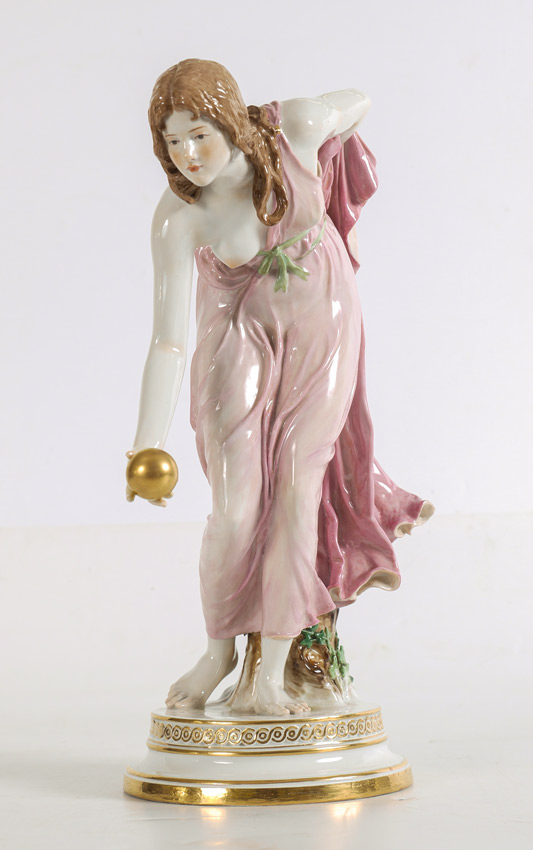 MEISSEN PORCELAIN FIGURE OF WOMAN BOWLING: Figure of a woman in a pink dress leaning over for lawn bowling, tree stump with ivy behind her after the original by Walter Schott. Meissen blue crossed swords mark and incised Q 180, overall measures 14'' h. x 6'' x 10 1/2''.