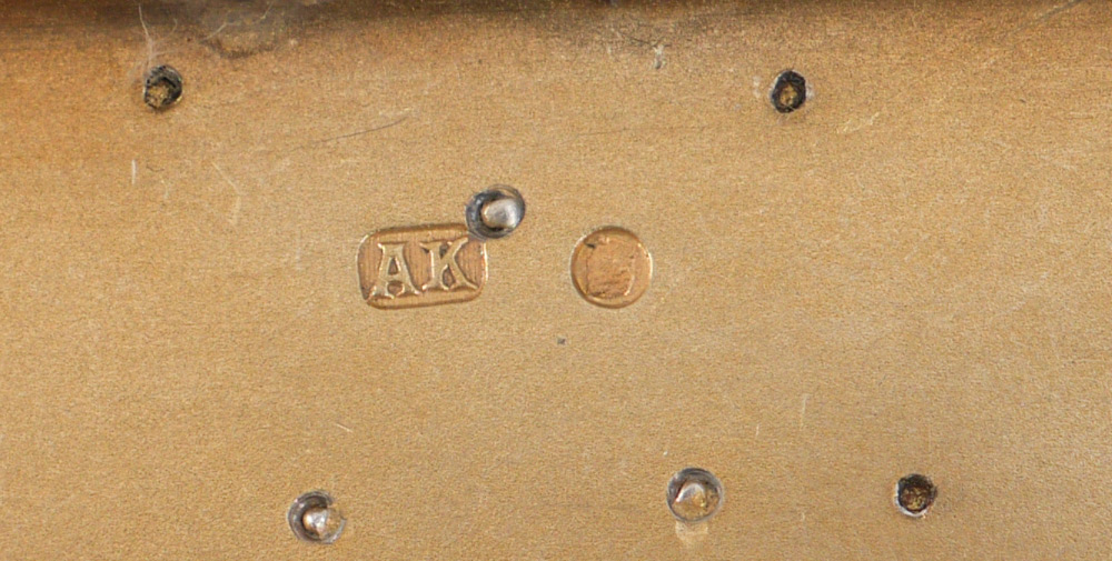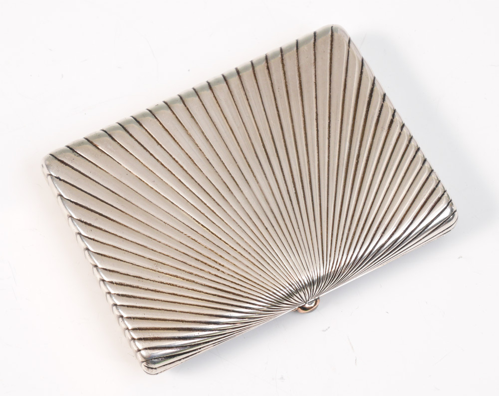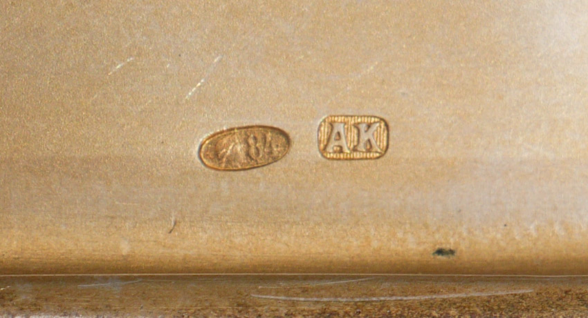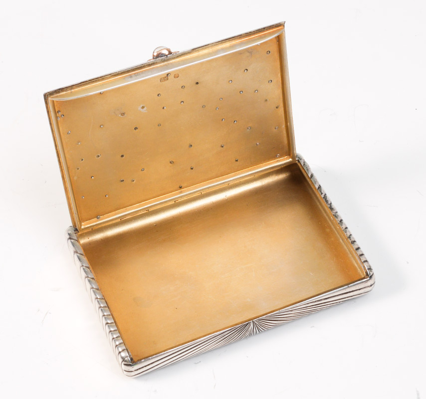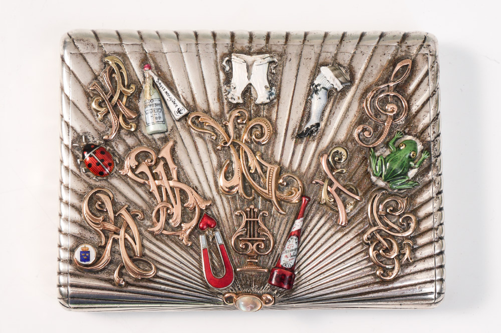 ALEXANDER KARPOV ENAMELED RUSSIAN SILVER CIGARETTE CASE: Hinged lid profusely decorated with enamel ladybug, frog, bottles, corset, woman's gartered leg, magnet and heart. Also, vermeil initials, musical notes and music stand. Ribbed body, vermeil interior marked with AK (most likely Alexander Karpov), and St. Petersburg 84 kokoshnik mark. Measures 3 7/8'' x 3'', approx. 6.1 troy oz.