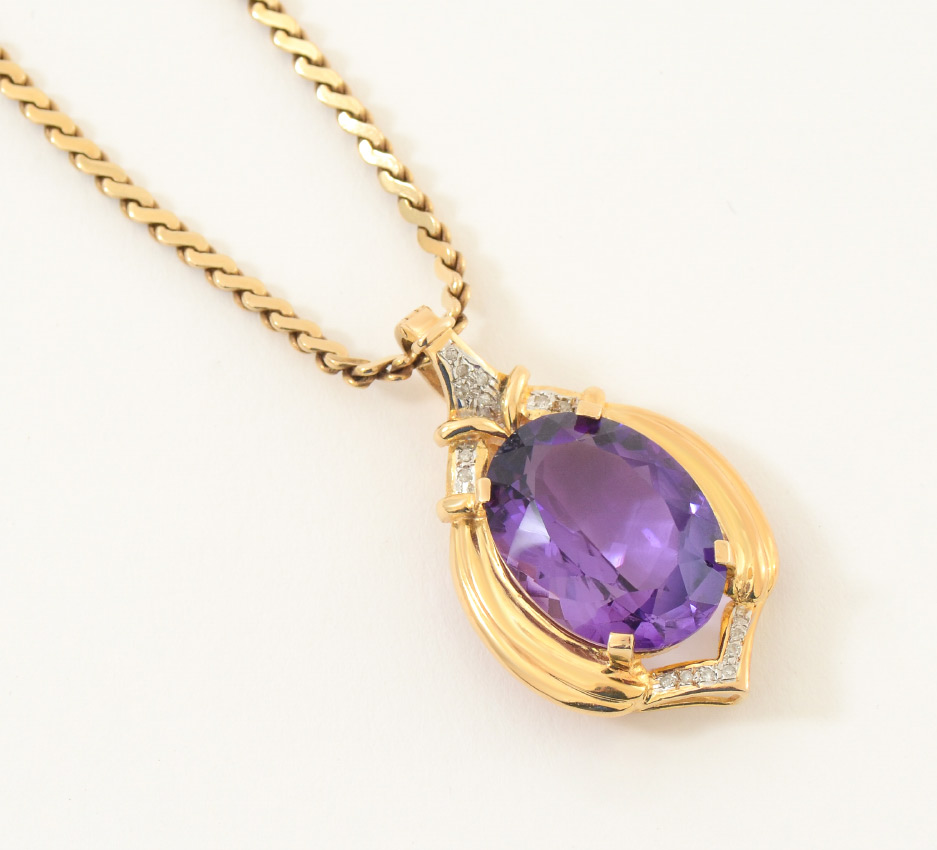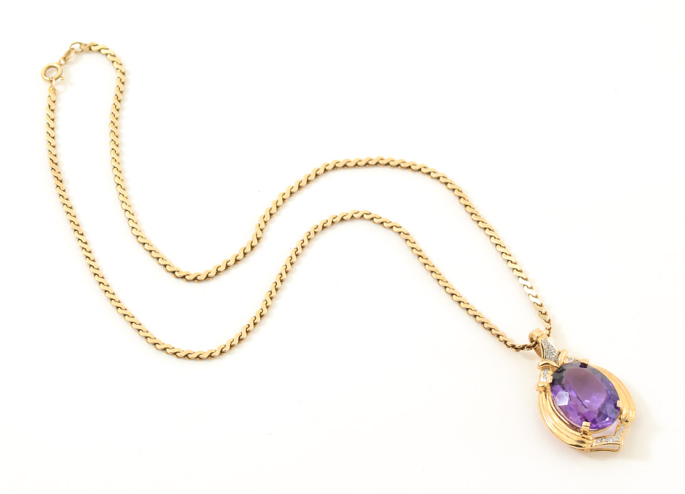19.60 CT AMETHYST PENDANT WITH DIAMONDS ON GOLD CHAIN ALL 14K: Oval natural amethyst is set into a lovely 14K yellow gold pendant and is dotted with 16 round full cut diamonds. Pendant is on 14K yellow gold serpentine neck chain. Total weight 24.3 grams.