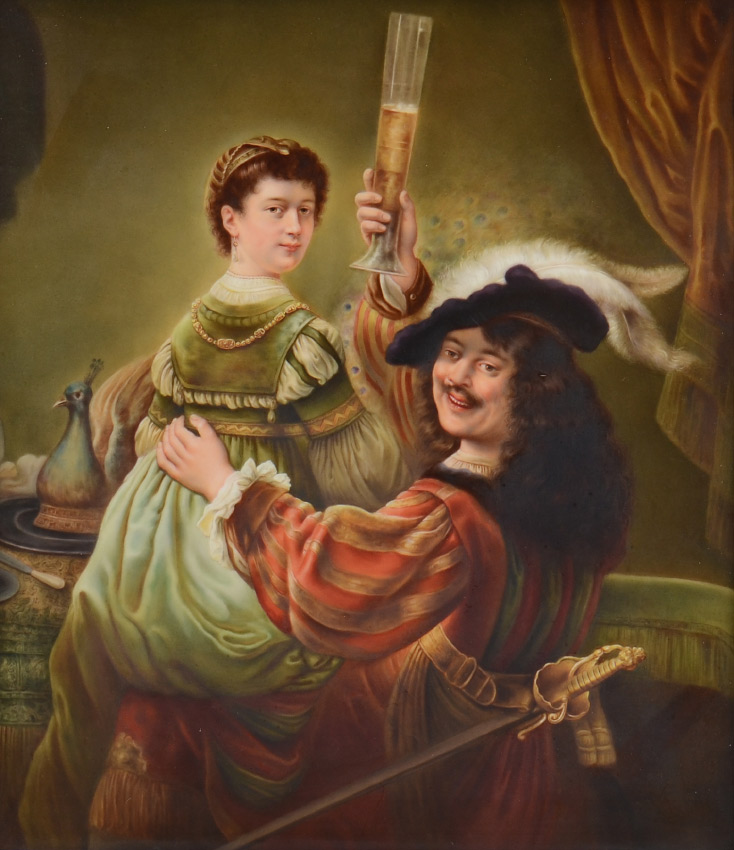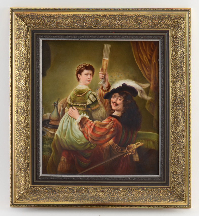 KPM PORCELAIN PLAQUE REMBRANDT AND SASKIA: signed lower right A. Kruse?, 13.25'' x 11.75'', impressed KPM scepter mark verso, framed, 18.5'' x 16.5''.