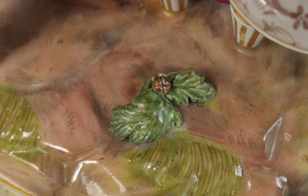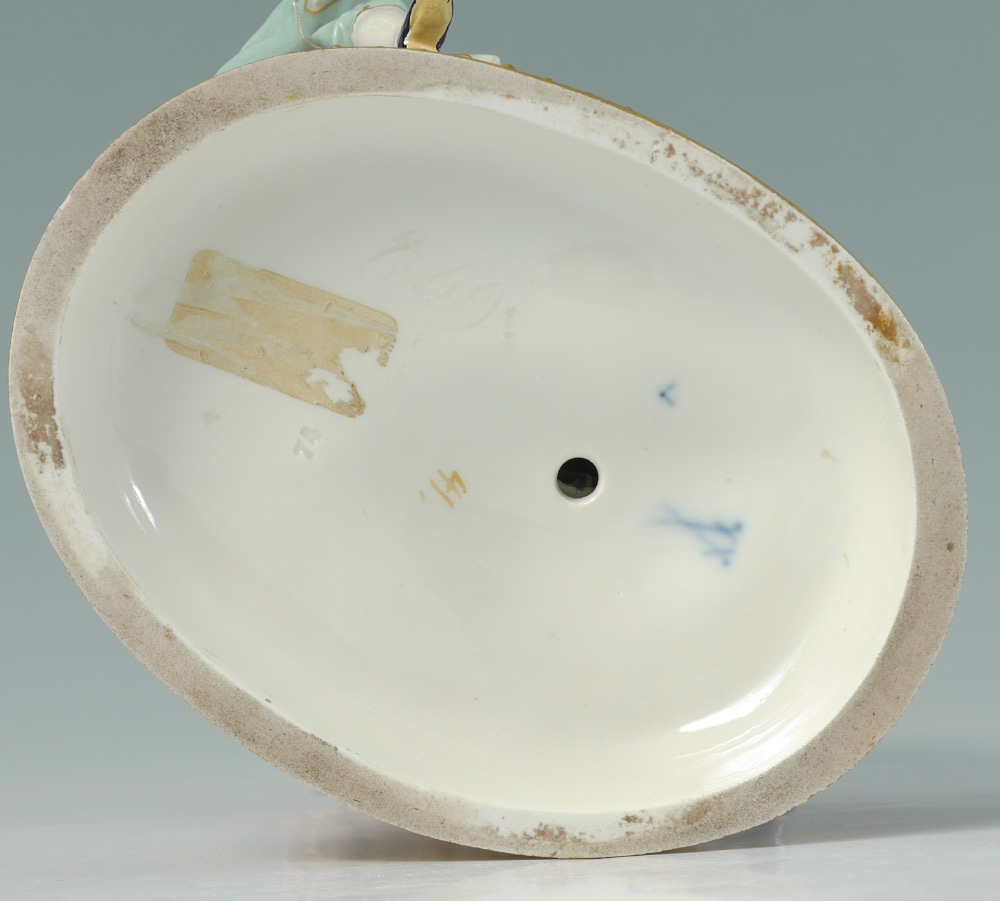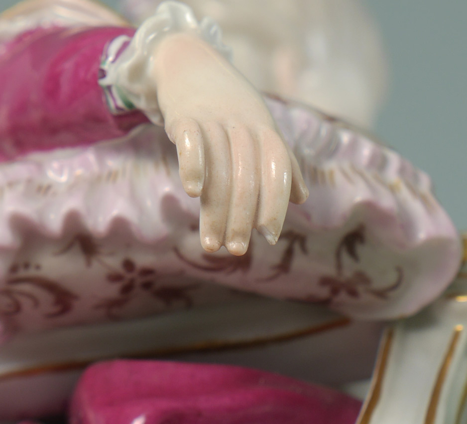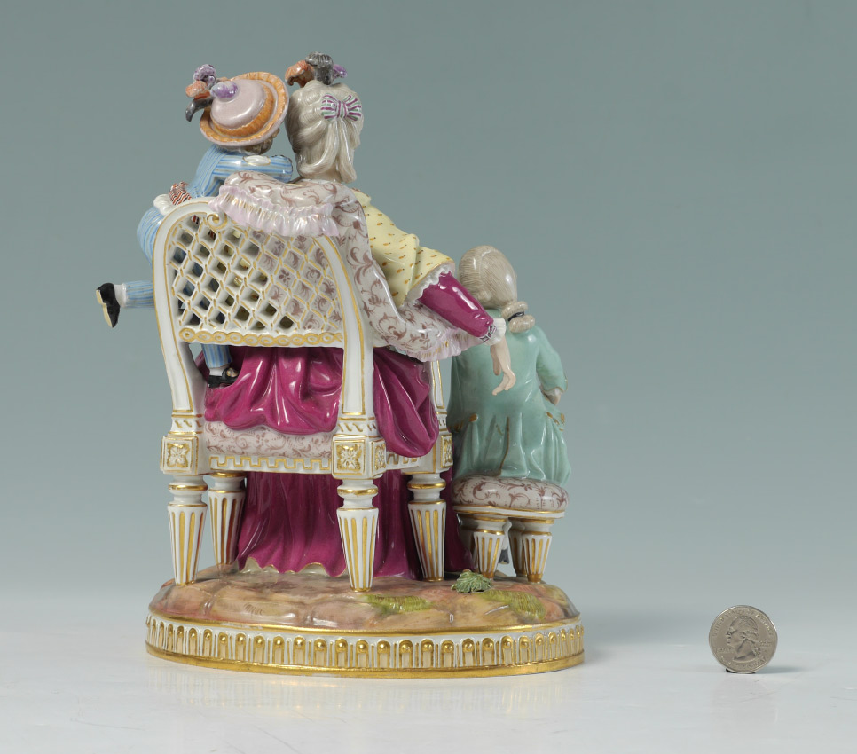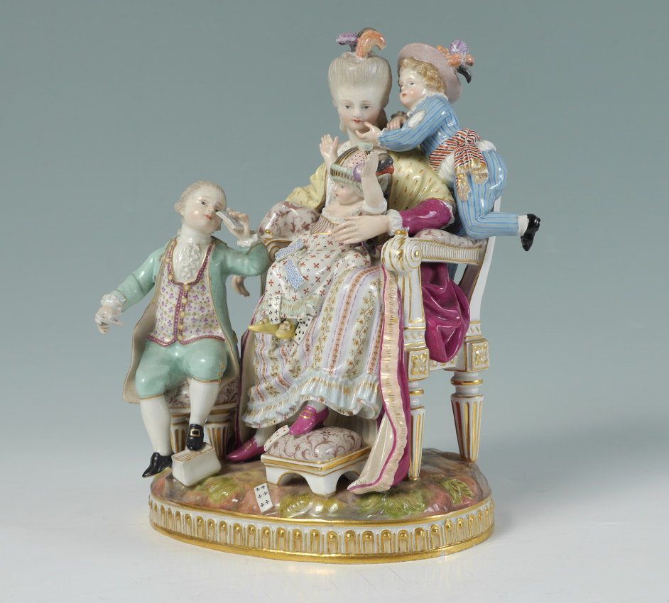 MEISSEN PORCELAIN FIGURAL GROUP OF MOTHER & 3 CHILDREN: ''The Good Mother'', originally by Acier, figure of a seated mother with her 3 children, one holding playing cards, the other climbing her back, the youngest seated on her lap. Crossed swords Meissen mark, impressed 74, incised E 69. Overall measures 8 3/4'' h. x 6 1/4'' x 6 1/2''.