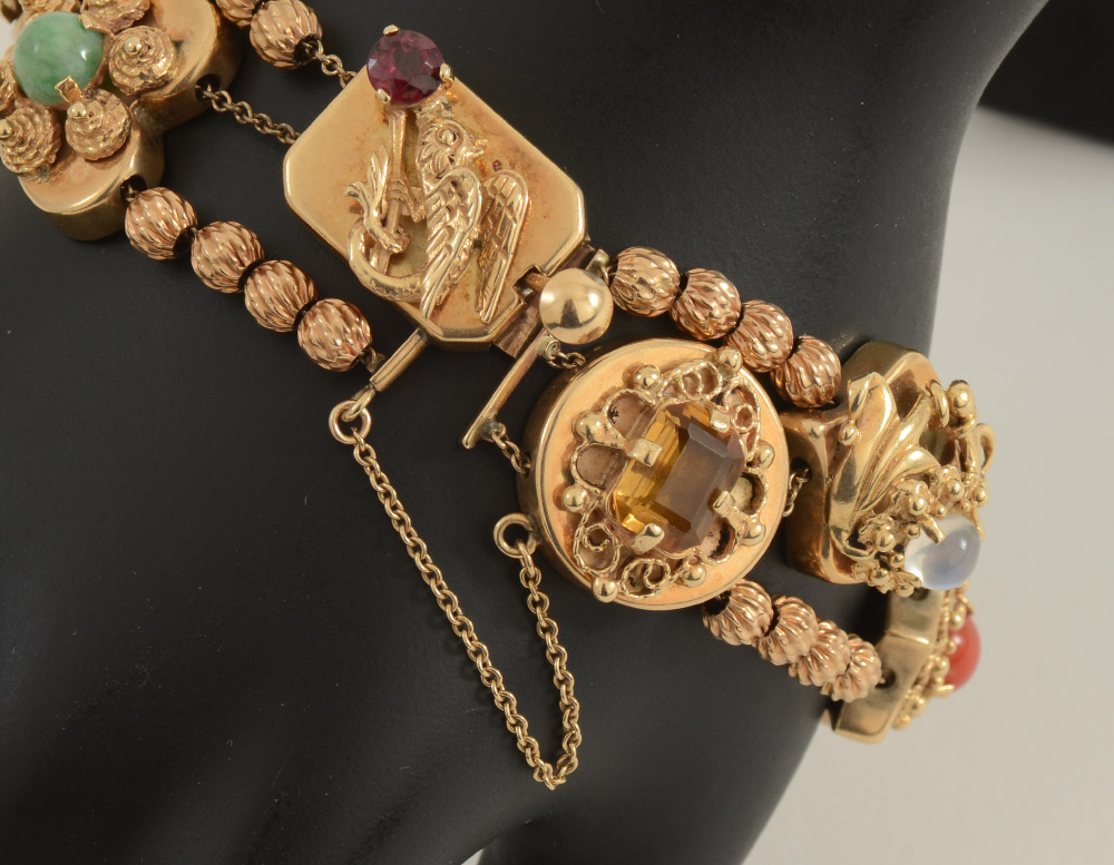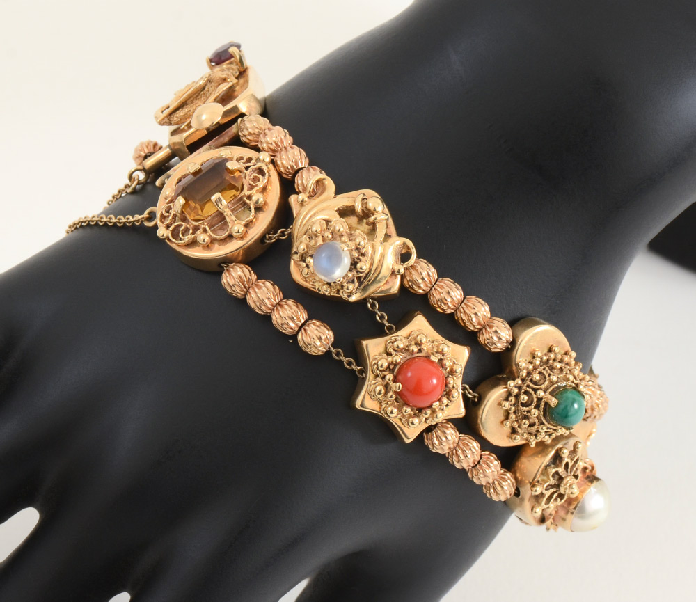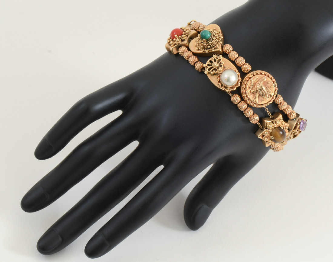 60.1 GRAMS 14K 10 STATION GOLD SLIDE BRACELET: 10 stations have various shapes and are set with a variety of stones including: garnet, jade, amethyst, tiger eye, Mabe, cultured pearl, green chalcedony, coral, moonstone, and citrine. Slides are separated by round yellow gold corrugated beads. Total weight 60.1 grams.