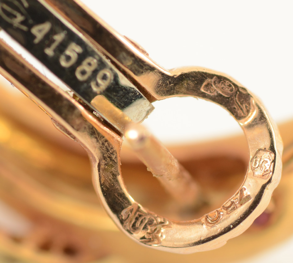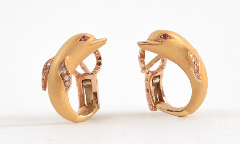 CARRERA Y CARRERA 18K GOLD & RUBY DOLPHIN EARRINGS: Full bodied dolphins poised as if raising from the water. Diamond encrusted fins, ruby eyes and the Carrera y Carrera signature matte finish. Marked with reference #41589,750. In original inner and outer display boxes with guarantee card. Total weight 8.1 grams.