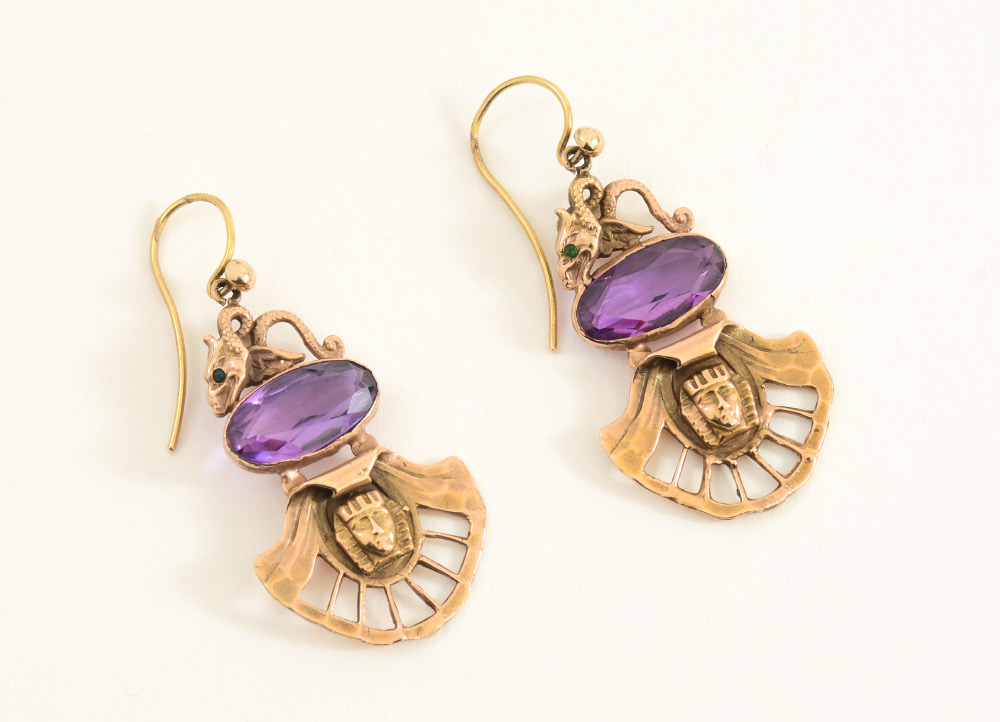 14K EGYPTIAN REVIVAL EARRINGS: 14K yellow gold Egyptian revival earrings containing two 16.00mm x 8.00mm oval shaped synthetic purple spinels. Spinels are bezel set. Two 1.00mm green stones of unknown origin. Shepard's hook wires. 1.5'' length. Total weight 12.6 grams.