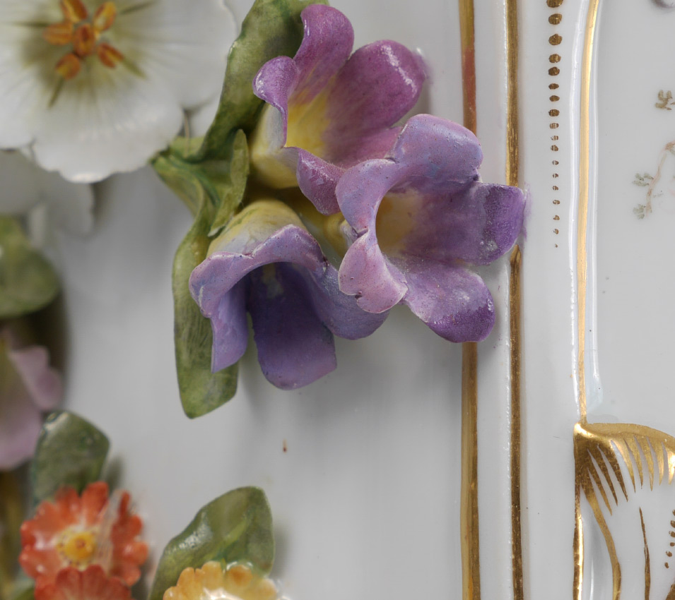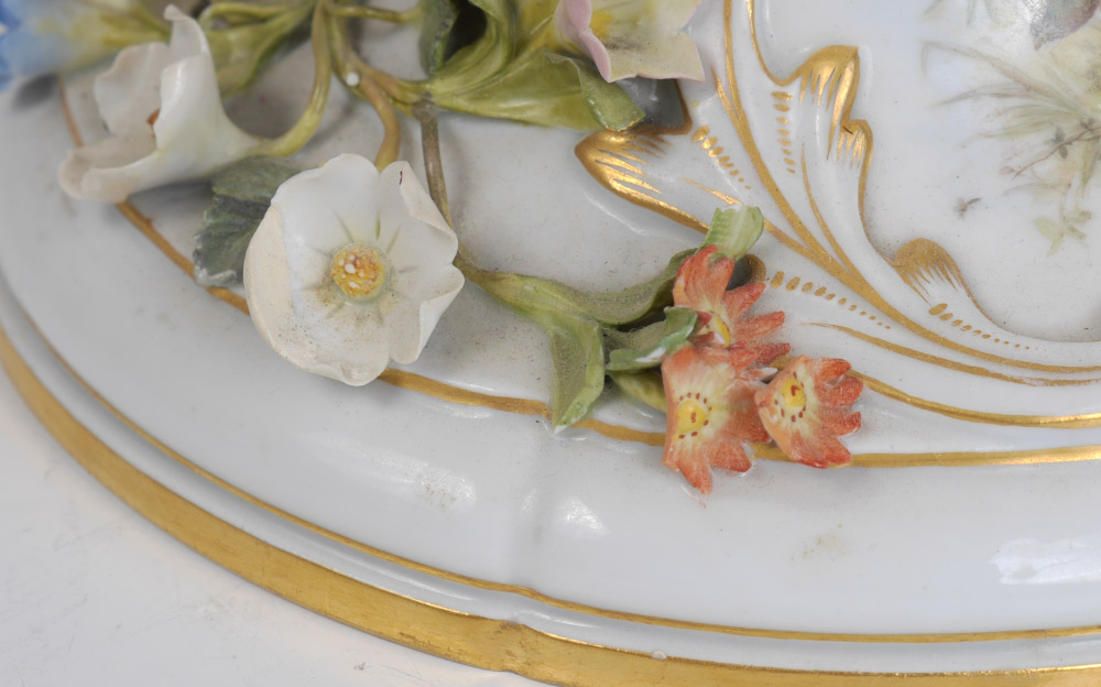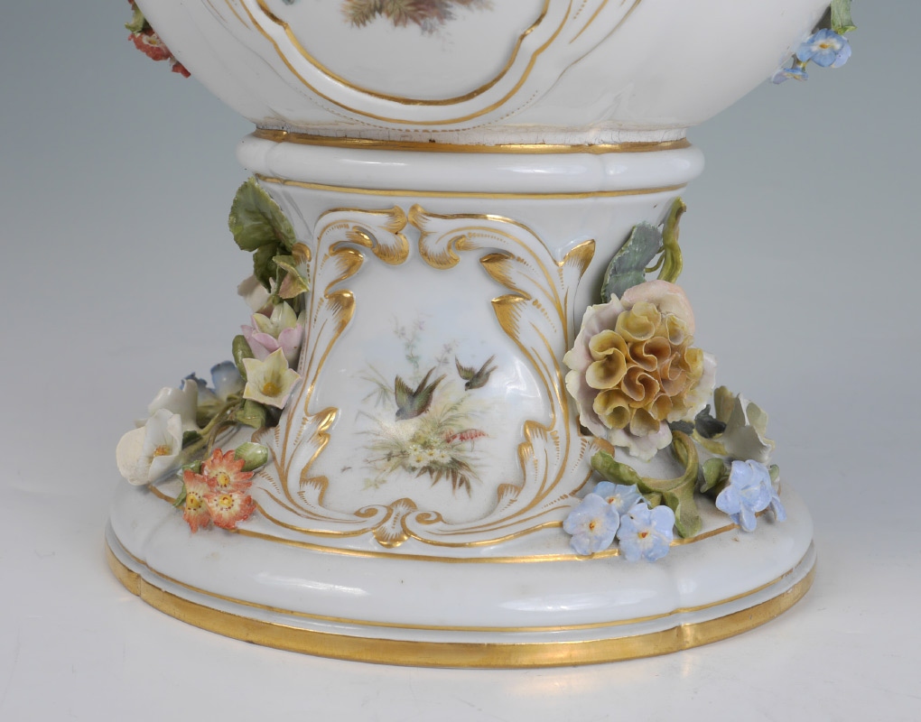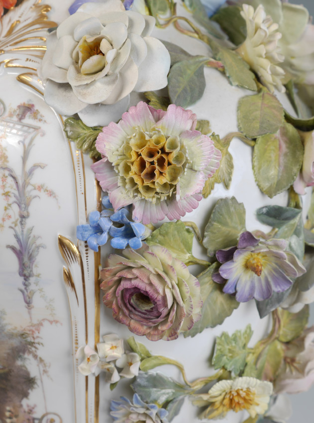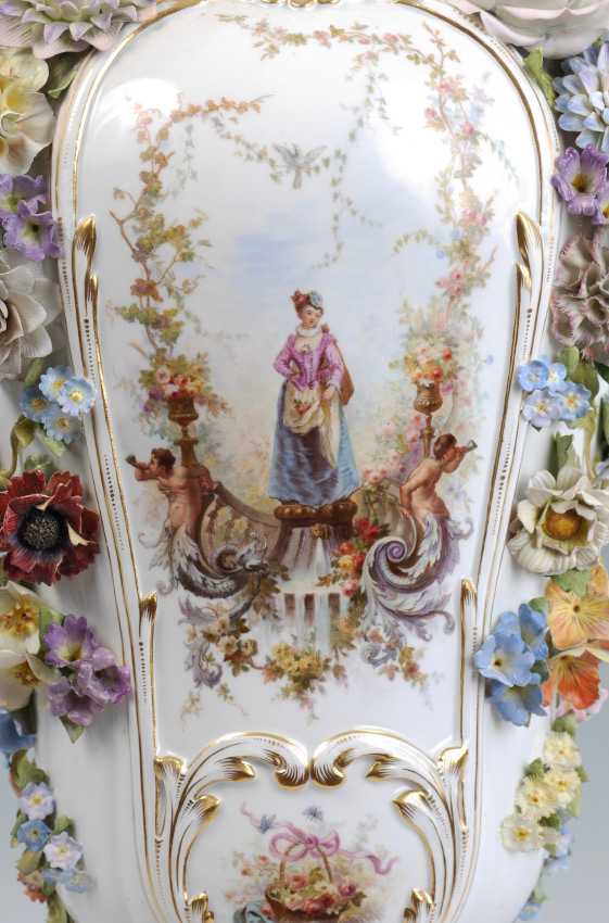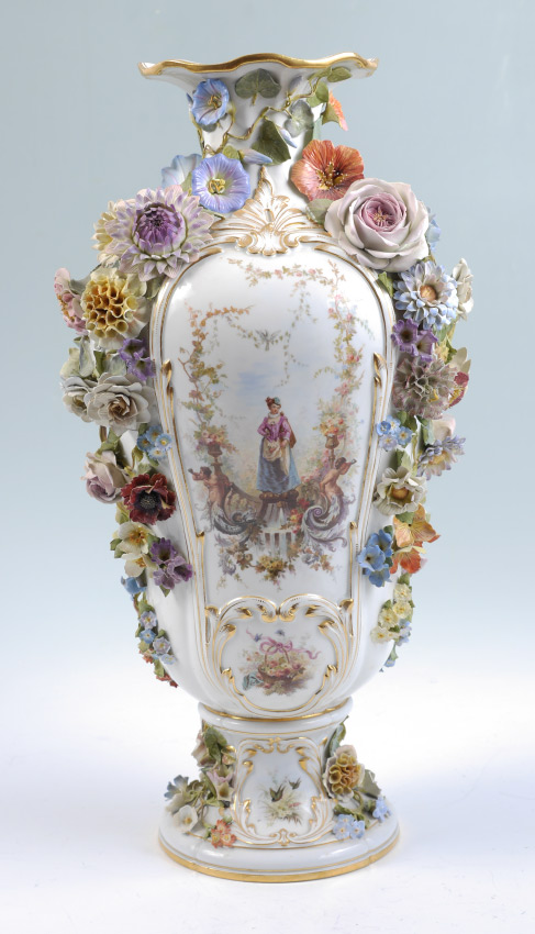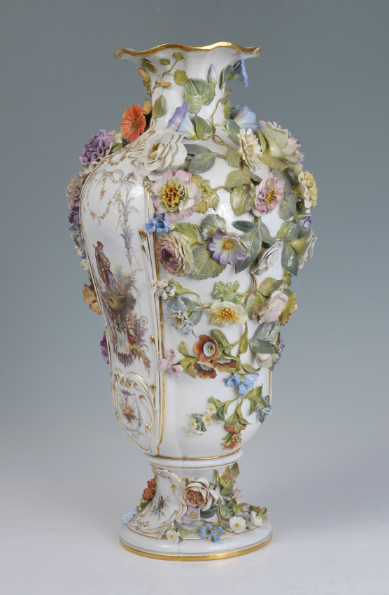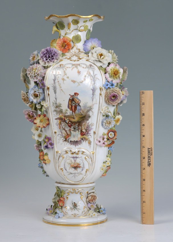 MONUMENTAL FOWER ENCRUSTED MEISSEN VASE: Tall vase profusely encrusted with an assortment of flowers, hand painted genre scenes either side and gilt accents. Blue crossed shields Meissen mark on base, measures 19 1/4'' h. x 10''.
