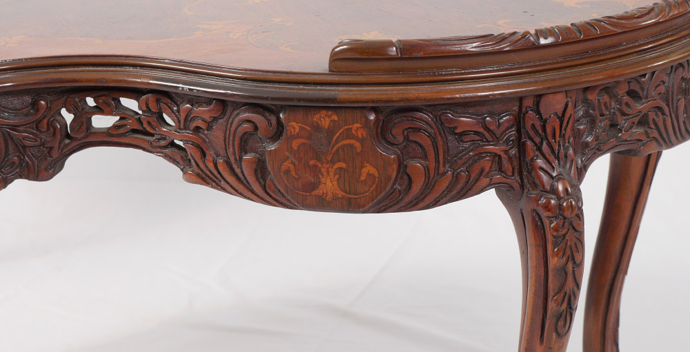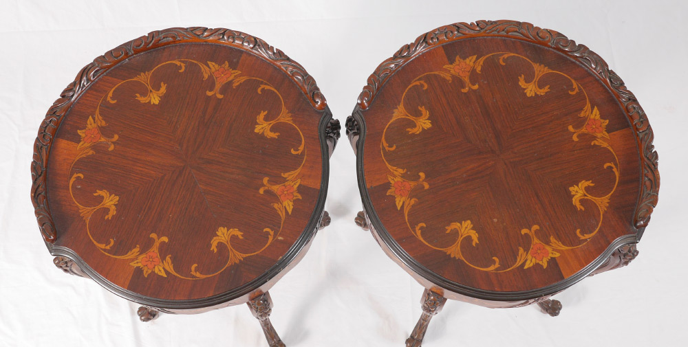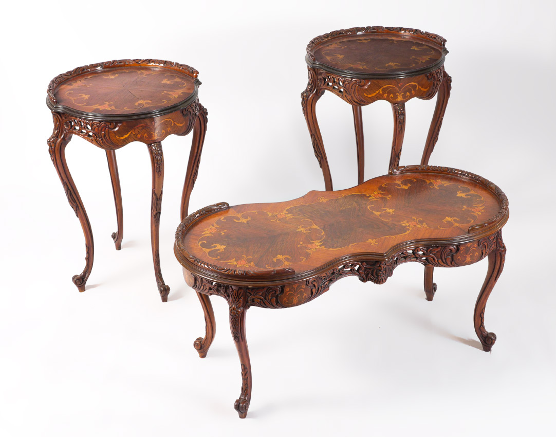 ITALIAN 3 PIECE FLORAL MARQUETRY TABLE SET: 3-piece matched set, floral marquetry inlaid tops with carved trim, pierce carved skirts with floral inlaid medallions, carved and shaped legs. cocktail table measures 19'' h. x 40 1/2'' x 19 1/2'', the 2 side tables measure 28'' h. x 40 1/2'' dia.