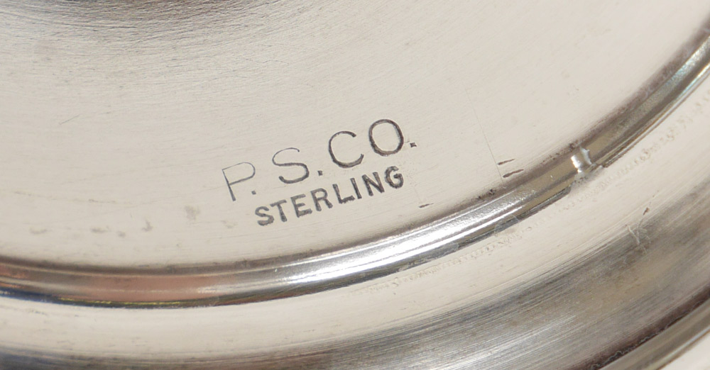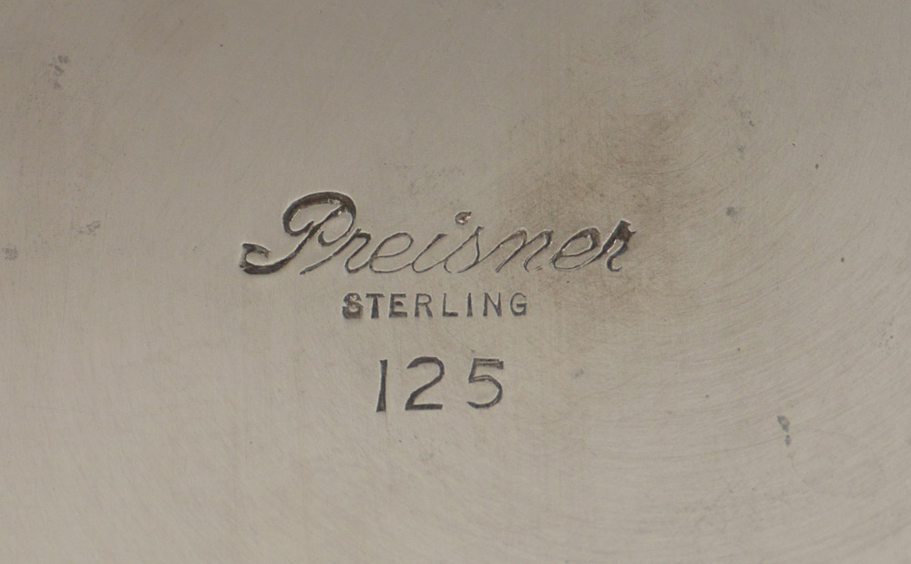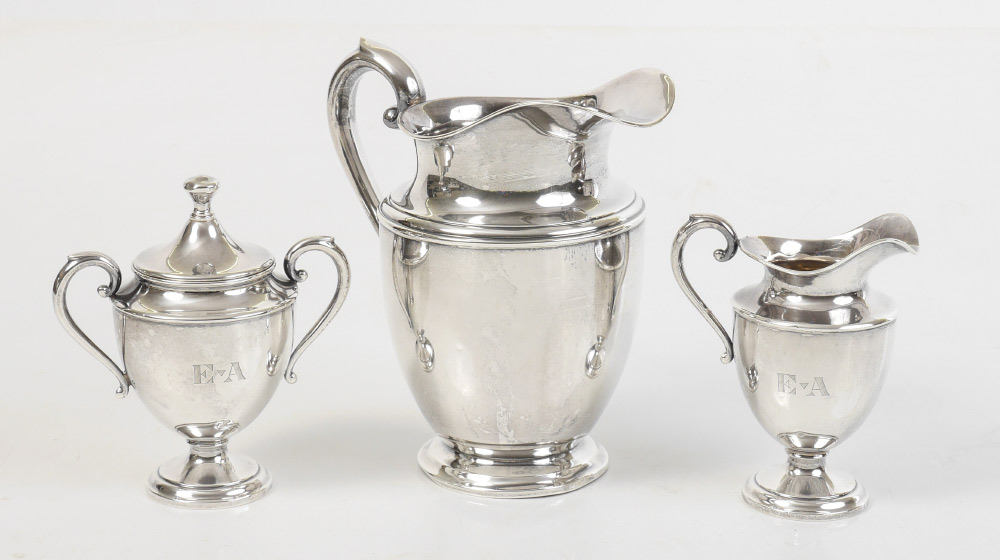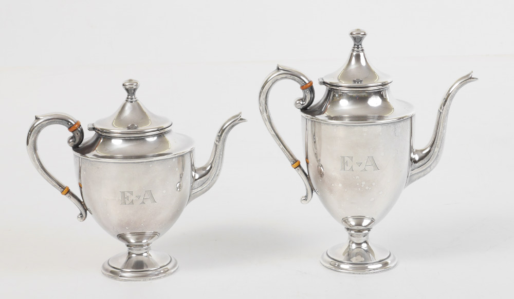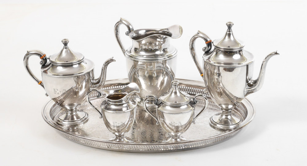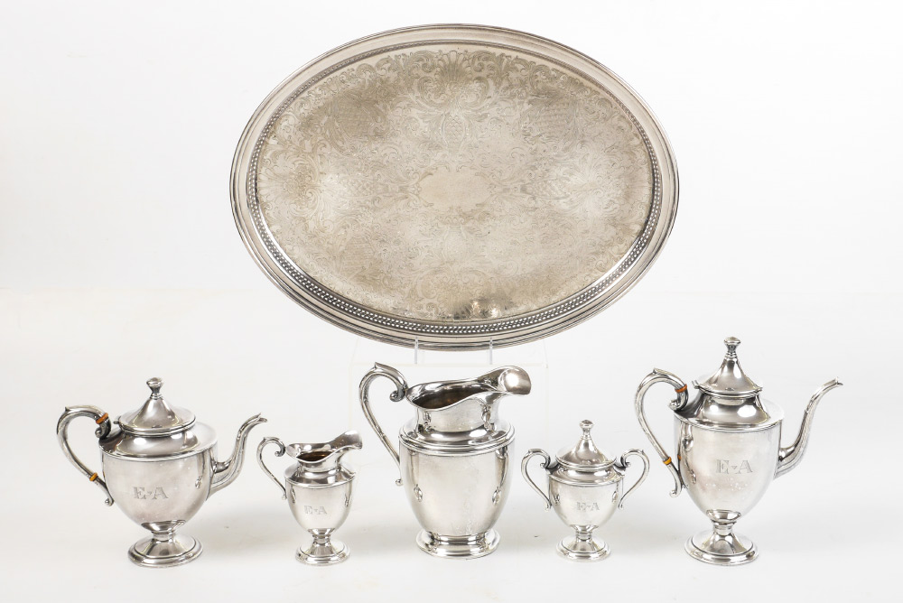 5 PIECE PREISNER STERLING TEA SERVICE: 5 pieces by Preisner Silver Co. to include 1) Coffee pot with hinged lid, 11 3/4'' h. x 9 1/2''. 2) Teapot with hinged lid, 8 1/2'' h. x 9 3/4''. 3) Covered sugar, 6 1/2'' h. 4) Open creamer 6'' h. 5) Water pitcher, 8 3/4'' h. x 8 1/2''. Sold with a Rogers silver-plate serving tray, 21 3/4'' x 16''. First 4 pieces monogrammed EA, approx. 72.2 troy oz.