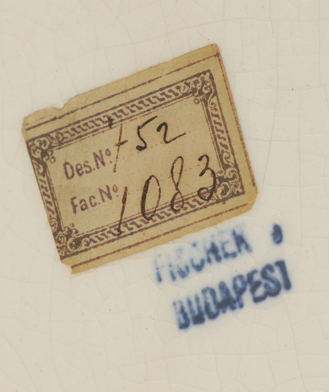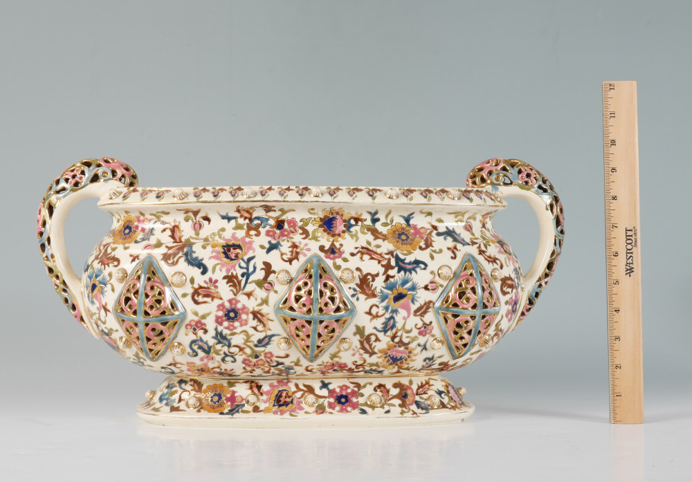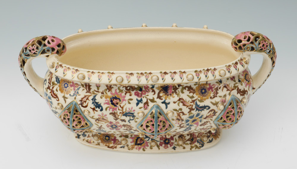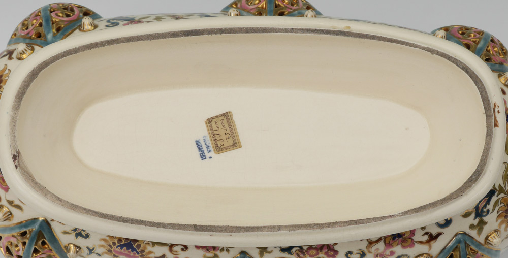 FISCHER BUDAPEST ZSOLNAY RETICULATED CONSOLE BOWL: Pre-1900 double reticulated pierced handles, cream ground body with polychrome floral decoration and formed reticulated panels, marked on base with blue Fischer Budapest mark and old paper label. Overall measures 9 1/2'' h. x 19'' x 9''