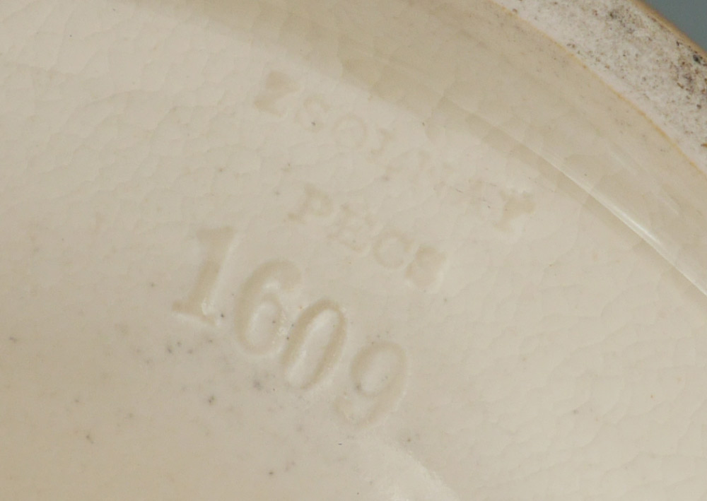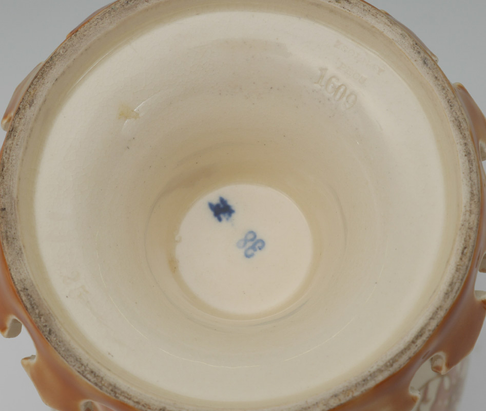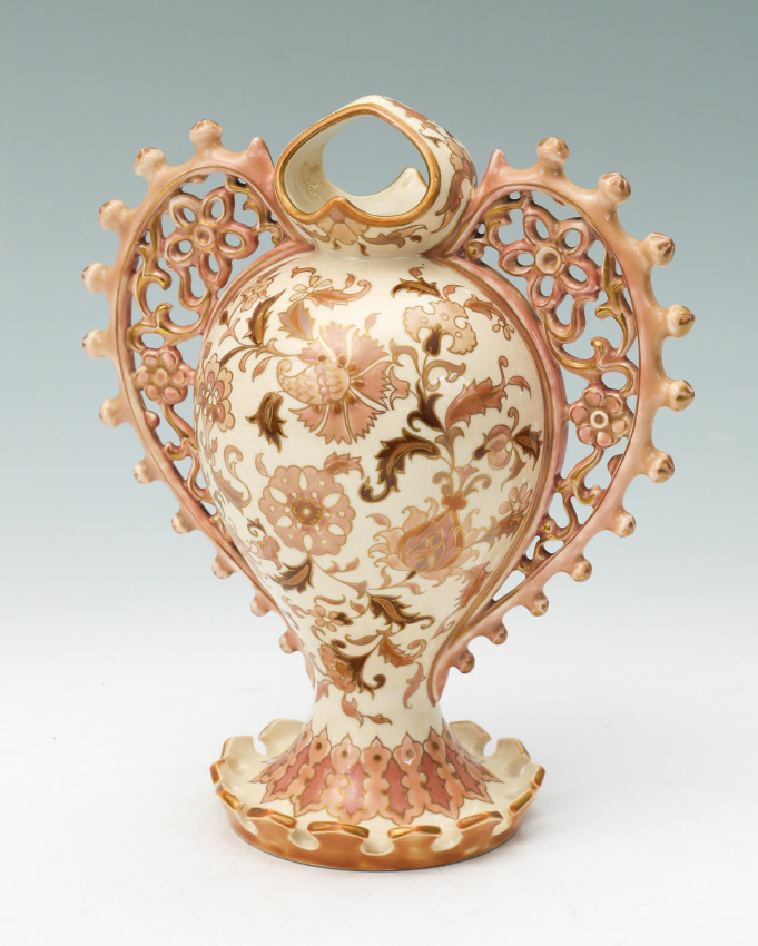EARLY ZSONLAY PIERCED DOUBLE HANDLE VESSEL: Covered top tim, pierced floral design double handles, body with cream ground, floral and gilt decoration, footed base with upturned ramparts. Impressed Zsolnay Pecs 1609 and blue marks. Overall measures 9 1/2'' h. x 8 1/2''.
