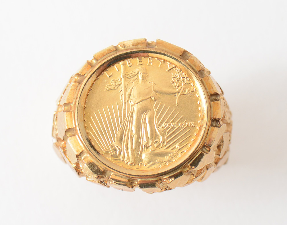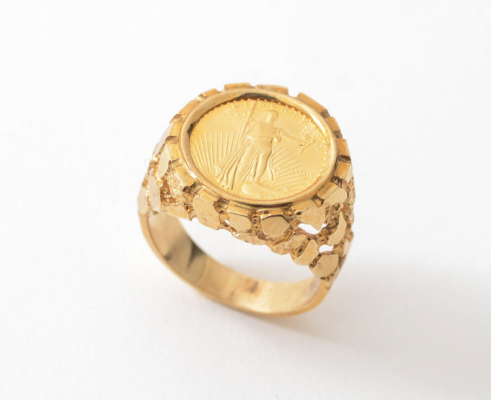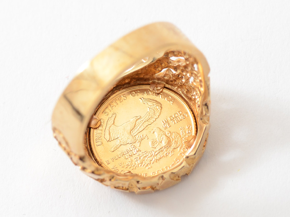 AMERICAN EAGLE 22K GOLD COIN RING SET IN 14K: 1992 1/10 ounce fine gold $5 half eagle coin set into 14K yellow gold nugget style ring. Size 11. Total weight 12.9 grams.