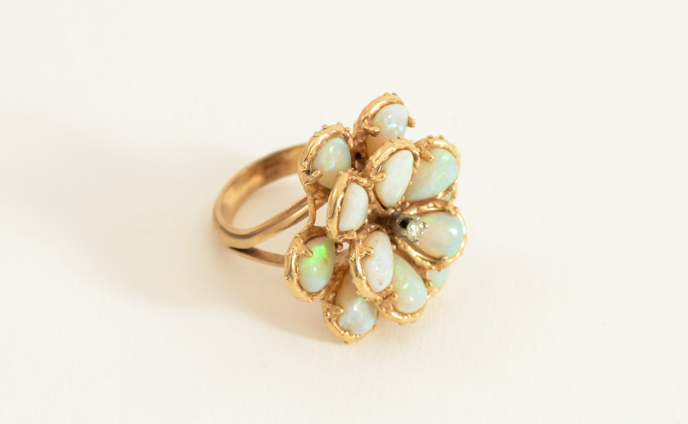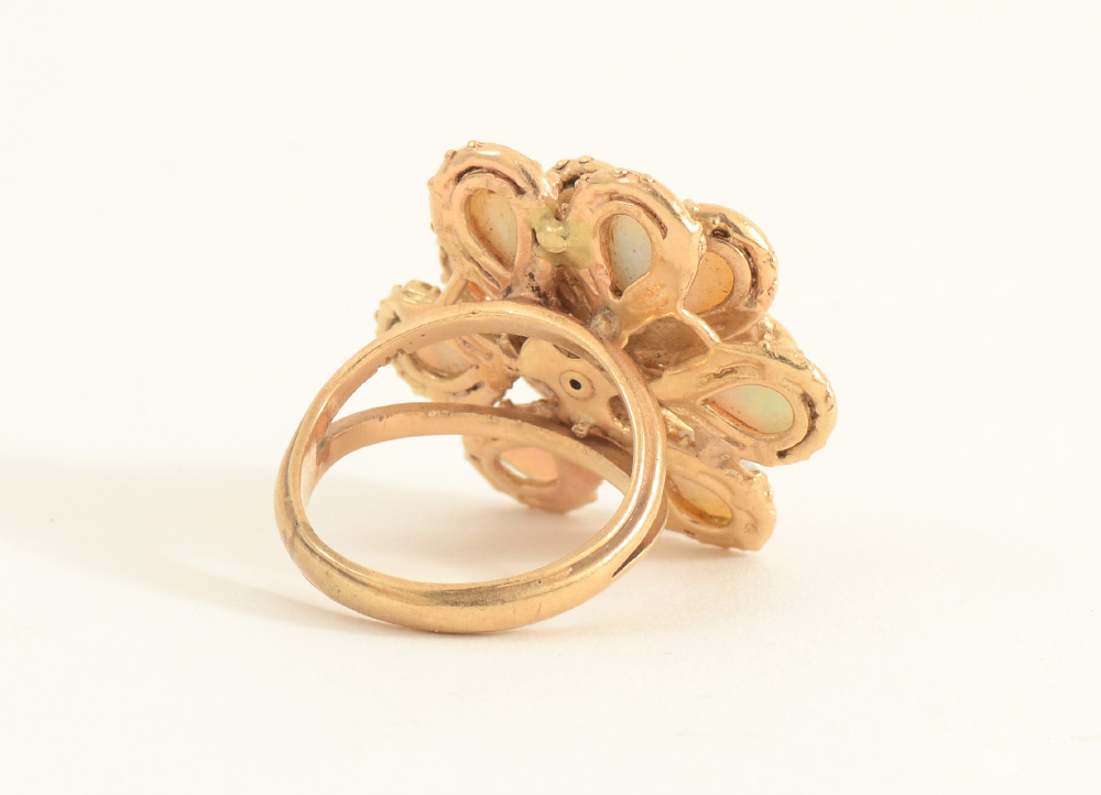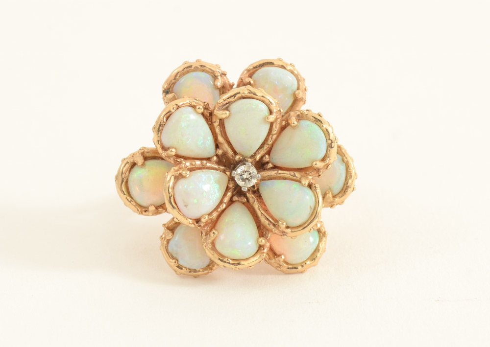 14K GOLD AND OPAL RING: 12 pear-shaped natural white opals form a flower shape around a small diamond center. 4.5 CTW opals are bezel set and diamond is prong set. Flower design is 1'' in diameter. Size 5.5. Total weight 9.8 grams.