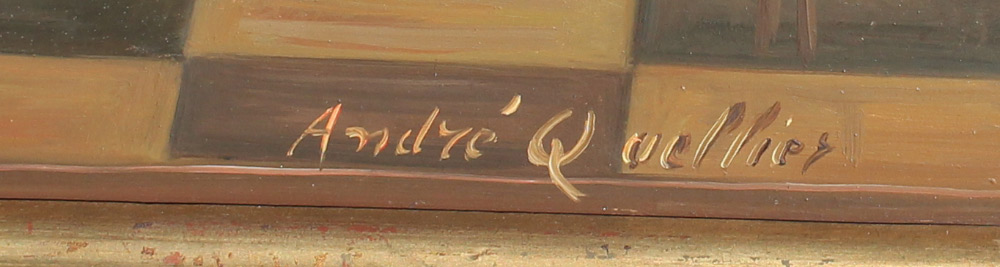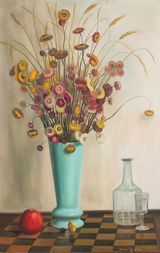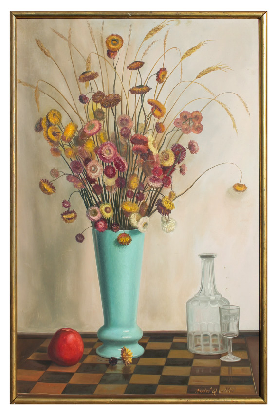 QUELLIER, Andre, (French, 1925-2010): Bouquet of Flowers in Blue Vase with Apple and Goblet, Oil/Masonite, 36'' x 23.5'', signed lower right, gilded wood frame, 37'' x 24.5.