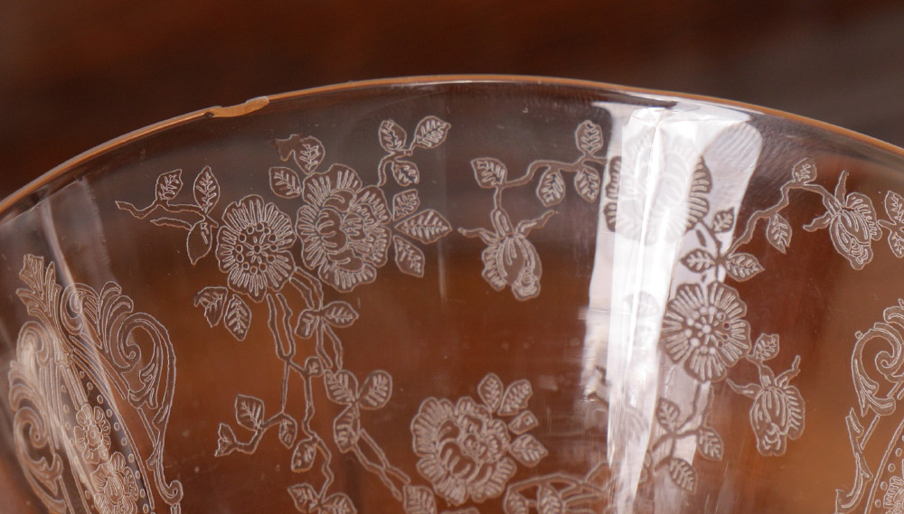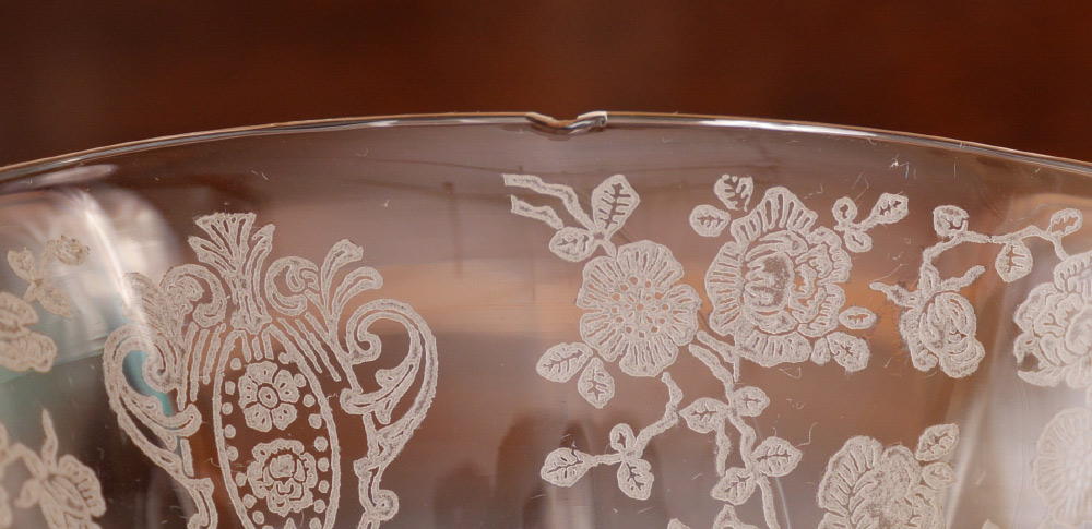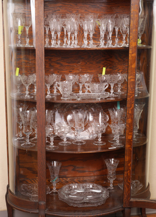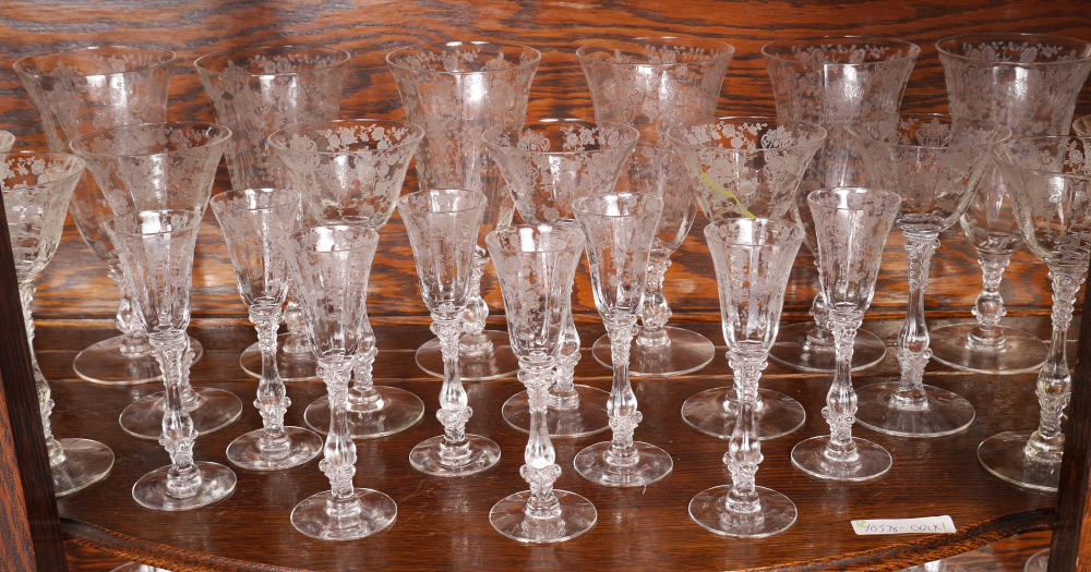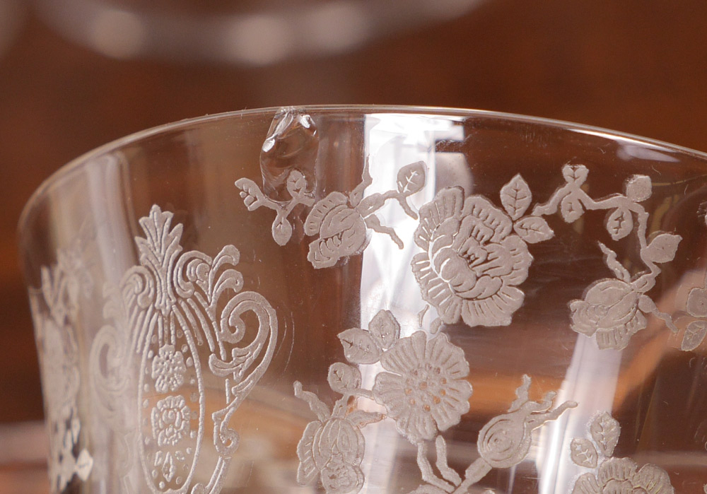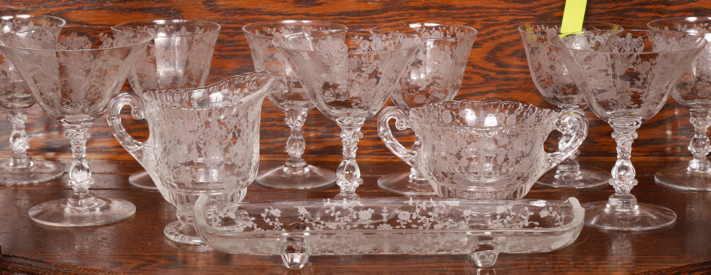 COLLECTION OF CAMBRIDGE ROSE POINT ETCHED GLASS: An assembled collection with 2 stems represented approx. 61 pieces total in the Rose Point pattern by Cambridge, one stem style to include 2 water goblets (8 3/8''), 9 iced tea (8 3/8'' h) and 4 low sherbets (4 5/8'' h.). The other style stem to include 8 footed tumblers (7''), 9 cocktail glasses (6''), 8 fruit cocktail (4 1/2''), 5 sherbet (4 3/4''), 8 cordial (5 3/8''), open cream and sugar, round serving plate (12 1/4''), 5 part relish (12 1/4''), square serving plate with handles (15 1/4''), handled low bowl (8 1/2''), square low bowl (7''), rectangular tray (9 3/8'').