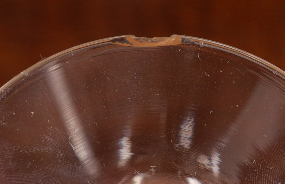 CONDITION: First stem style 2 water goblets with rim chips. Second stem style 4 footed tumblers, 1 cocktail, 2 fruit cocktail with foot or rim chips.