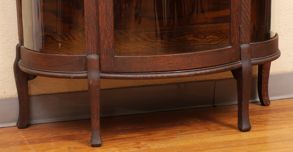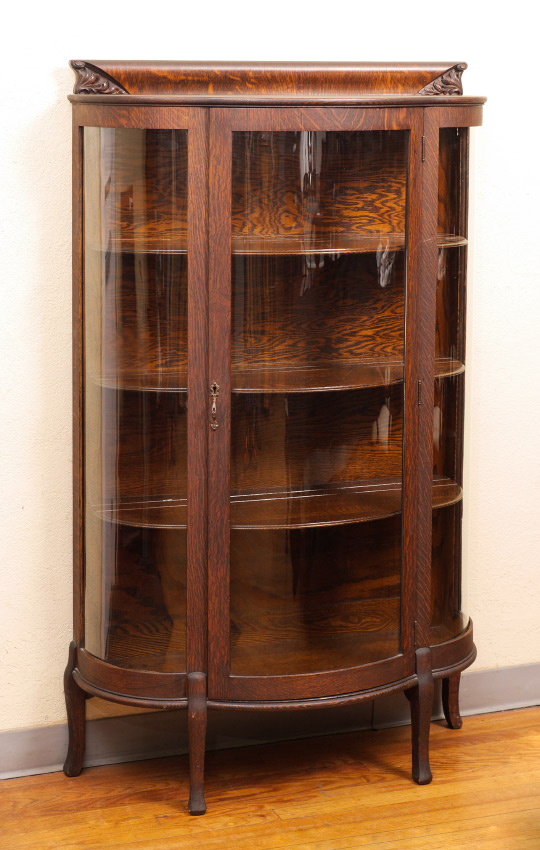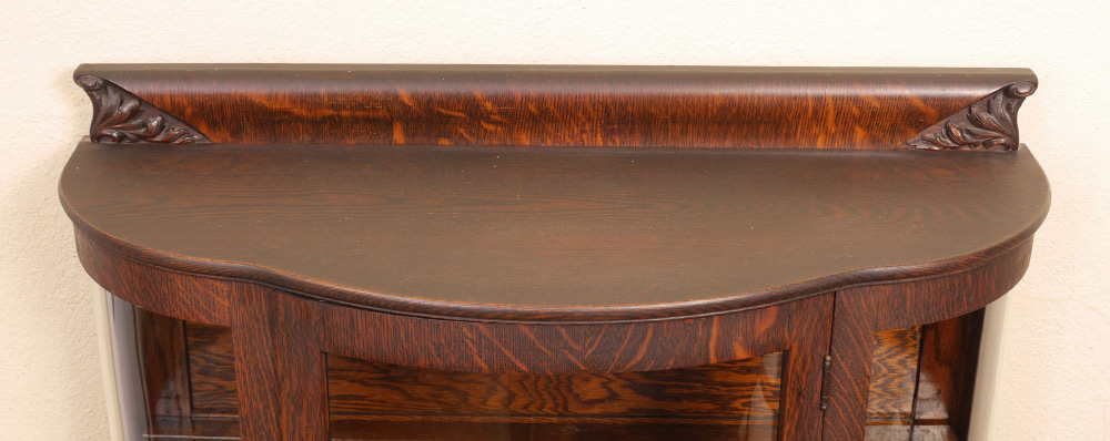 DIMINUTIVE TRIPLE BOW FRONT OAK DISPLAY CABINET: Top backsplash carved at either end, triple glass bowfront, 3 internal wood shelves, overall measures 60 1/2'' h. x 36'' x 14''.