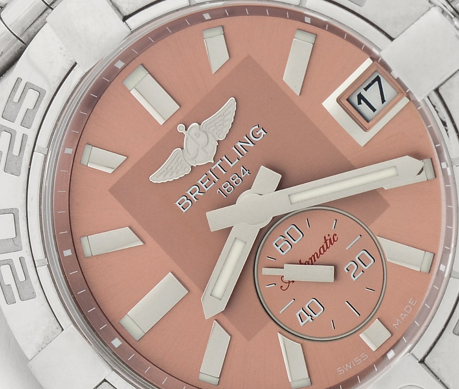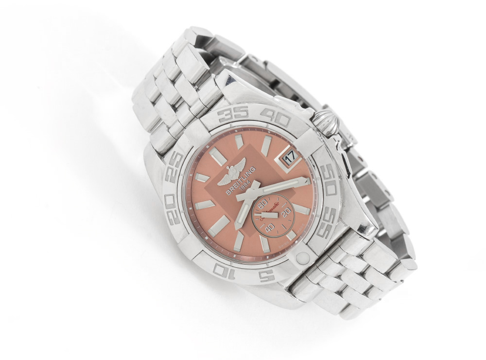BREITLING GALACTIC WATCH WITH BRONZE DIAL: Unisex stainless steel Breitling Galactic wristwatch A37330. Integrated stainless steel bracelet. 36mm case diameter. Uni-directional rotating bezel. Bronze dial with silver index markers; date aperture at the three o'clock position; small seconds sub-dial at the six o'clock position. Sapphire crystal.