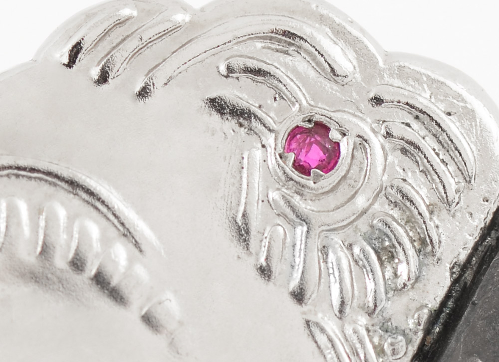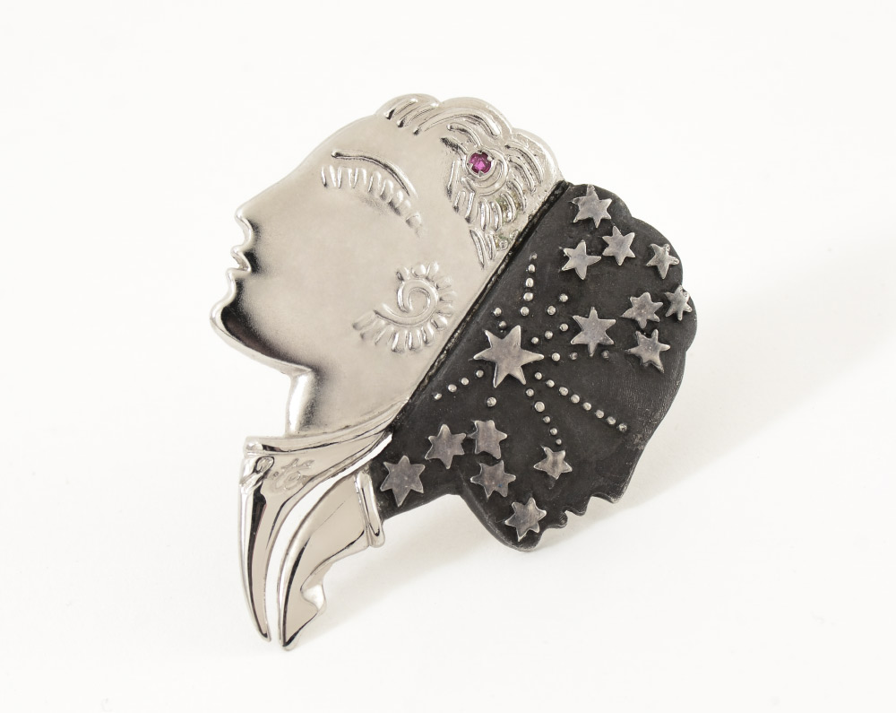 UNUSUAL SILVER & BLACK DOUBLE PROFILE ERTE PIN: This is a lovely Erte pin/brooch signed on front and numbered 247/500 on back. Stamped CFA S/S '90 on back (the year of his death). In wonderful, gently used condition. Measures approx 1.34'' w x 2'' long. Has a ruby colored stone on 'day' side of profile. Weighs 15 grams. No original box