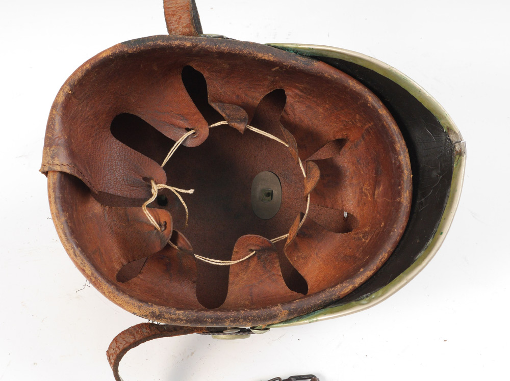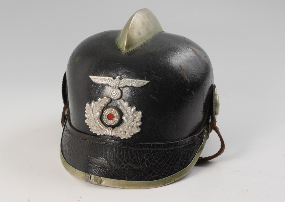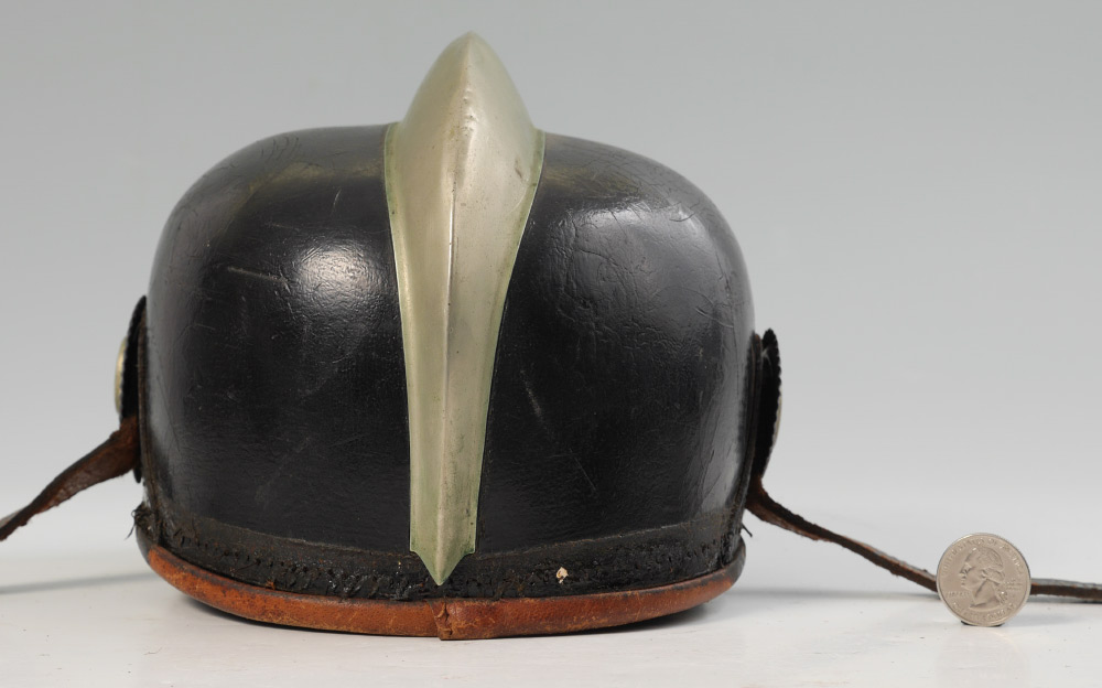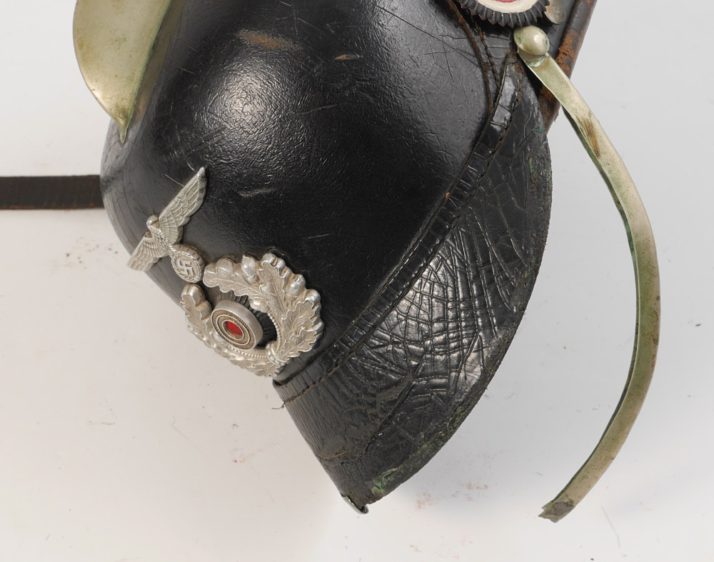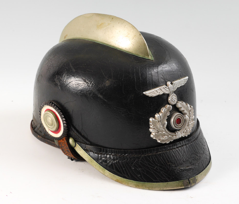 GERMAN WWII LEATHER FIRE FIGHTERS HELMET: Leather shell, metal comb and front band, front with winged eagle and laurel wreath emblems, leather chin strap. Overall 6 1/4'' h. 7'' x 9 1/4''.