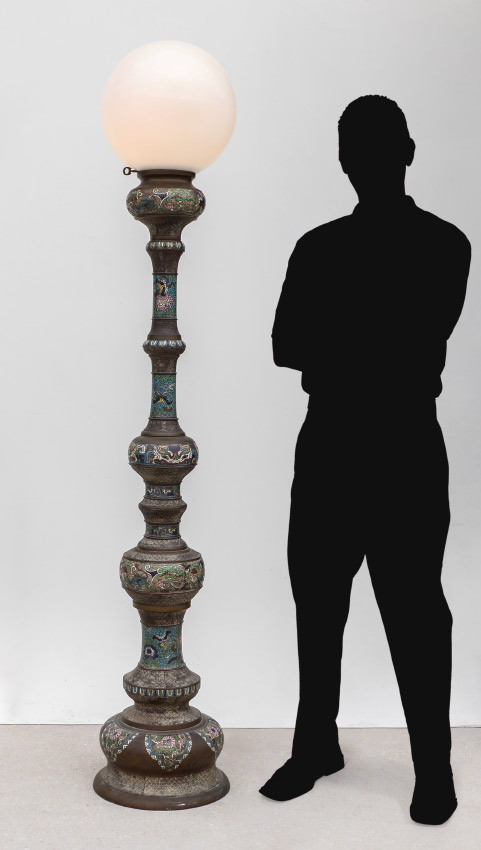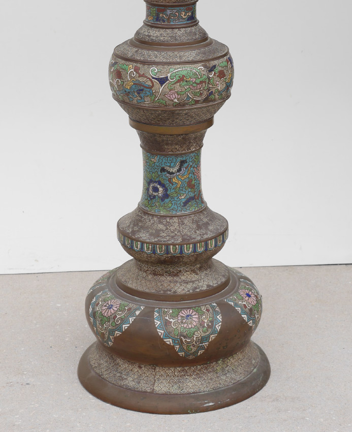CHINESE CHAMPLEVE FLOOR LAMP TORCHIERE: Electrified, bronze with floral motif champleve enamel bands. Overall measures 60 1/4'' h. x 13'' base dia. Sold with a plastic globe shade, 12'' dia.
