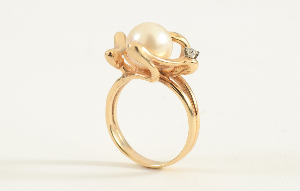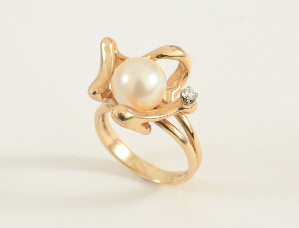 CONTEMPORARY 14K PEARL AND DIAMOND RING: 9.4mm cultured pearl centers this sophisticated 14k yellow gold ring punctuated with a .07 CT diamond. Size 7.5. Total weight 8.0 grams.