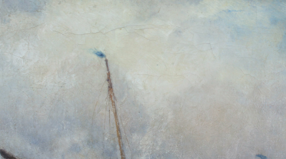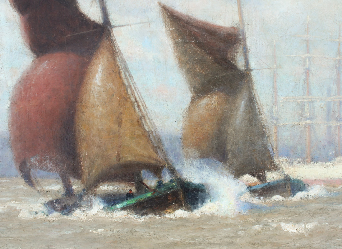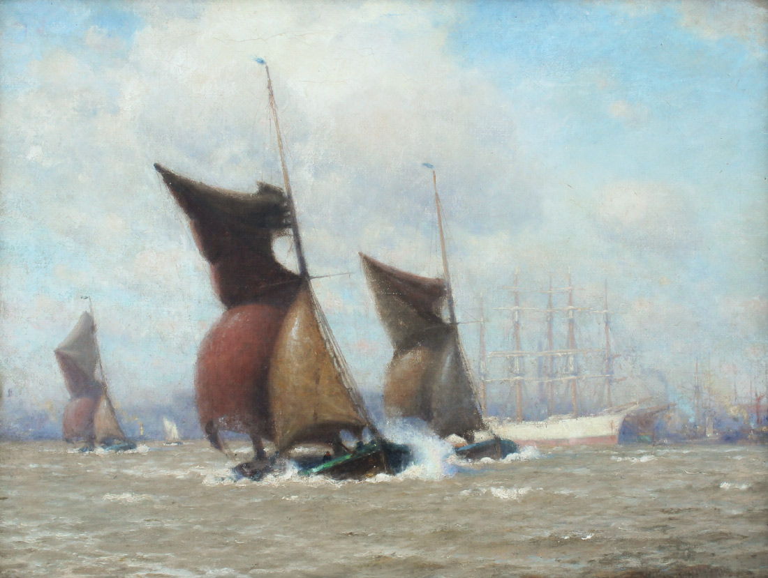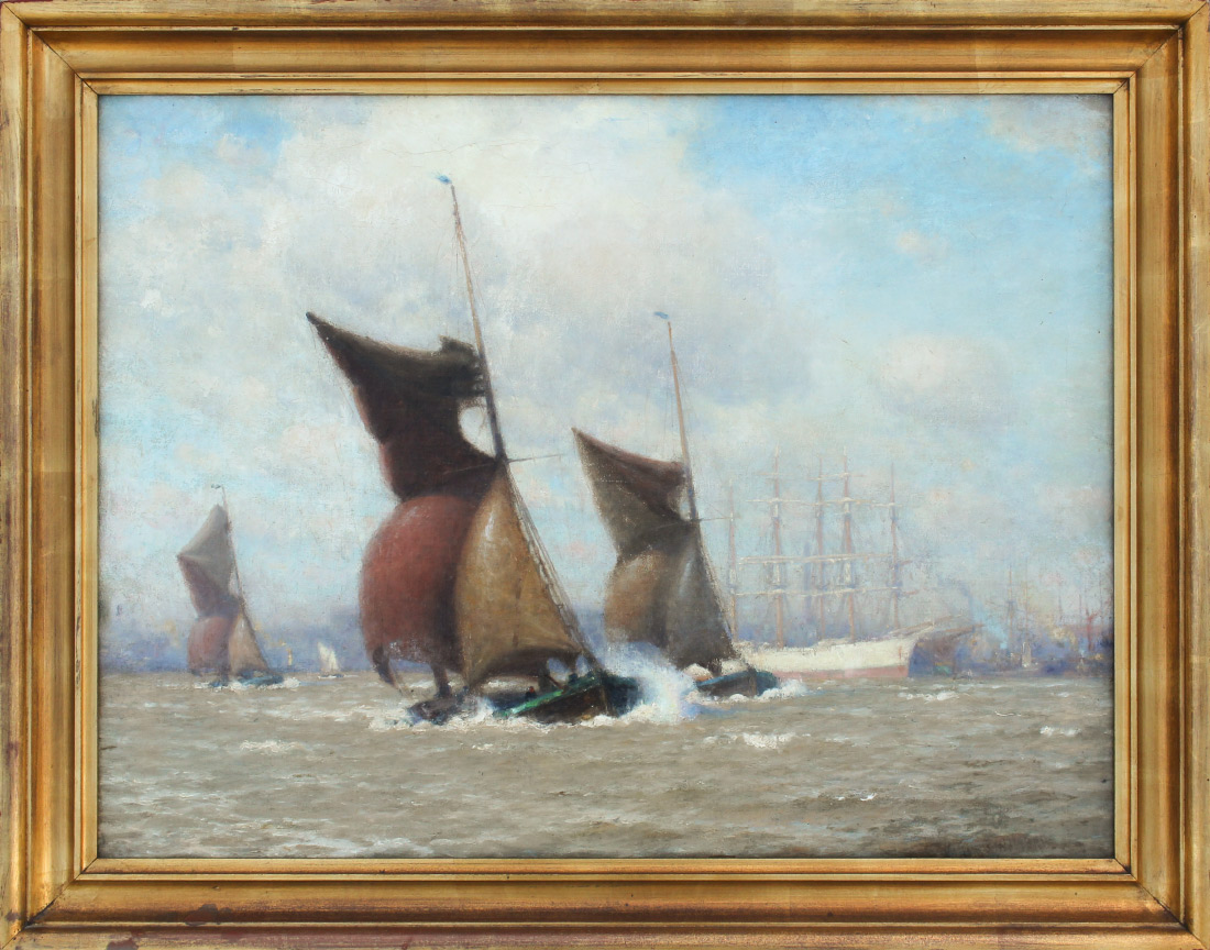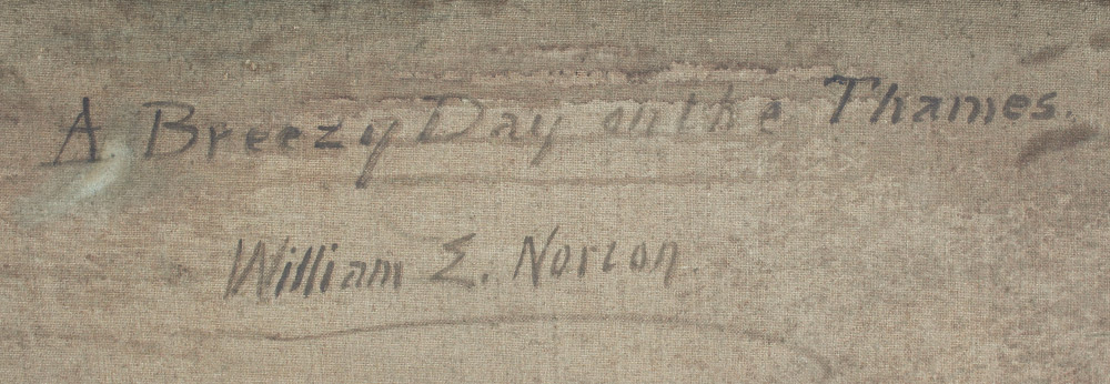 NORTON, William Edward (American, 1843-1916): ''Breezy Day on the Thames'', Oil/Canvas, 23.25'' x 30.25'', signed lower right, also signed and titled verso, framed, 27'' x 34.25''. Norton sailed on family owned ships and developed a love for marine painting. He studied at the Lowell Institute and then studied in Paris with Chevreuse and Vollon. He was known for his scenes of the coast and the Thames. He exhibited in Boston, London, Paris and Chicago.