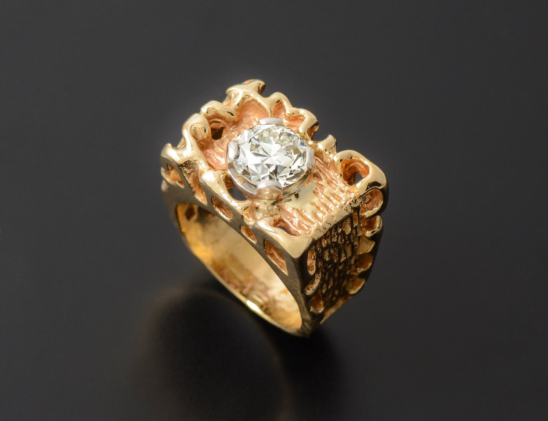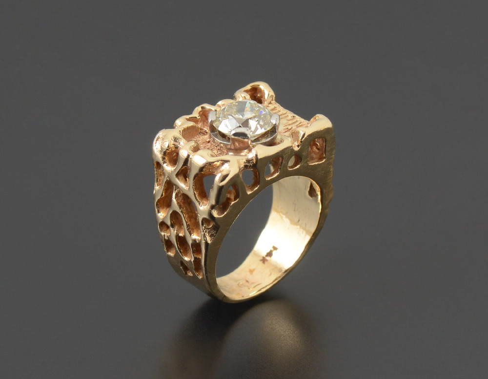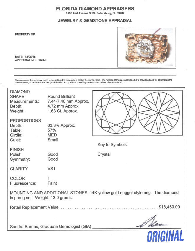 DAZZLING 1.63CT DIAMOND SET IN 14K NUGGET RING: 1.63 CT round brilliant cut diamond is VS1 in clarity and I in color. Ring is 14K yellow gold nugget style. Size 5.5. Total weight 12.0 grams. Sold with current Florida Diamond Appraisers GIA graduates appraisal for $18,450.