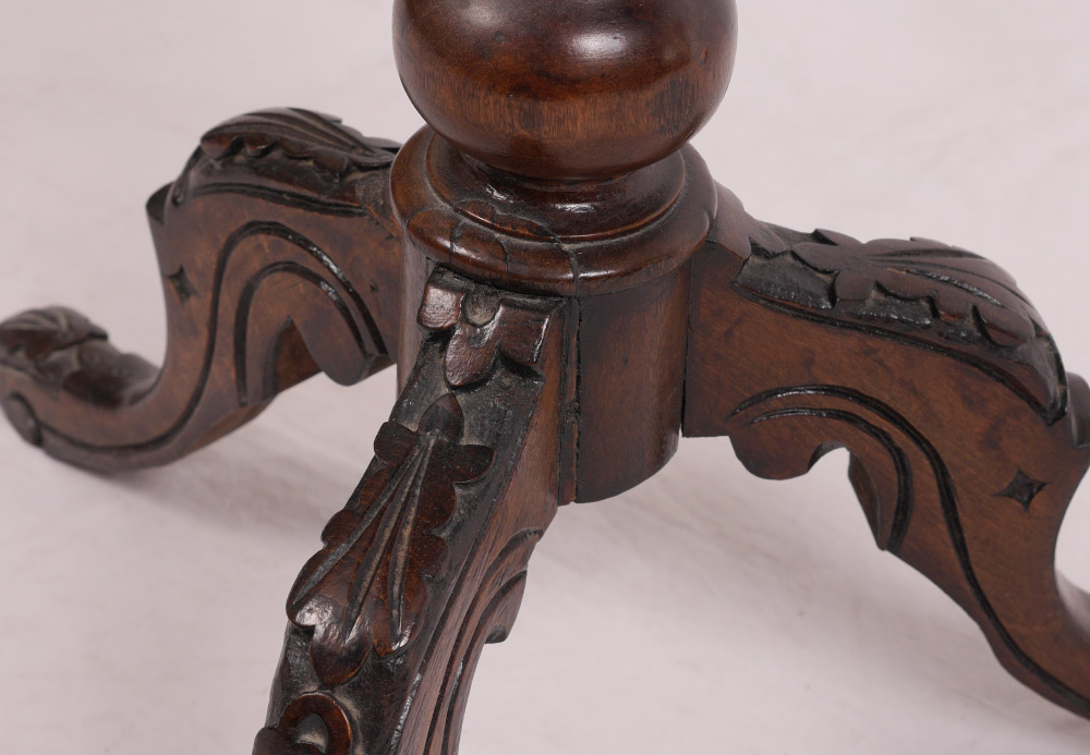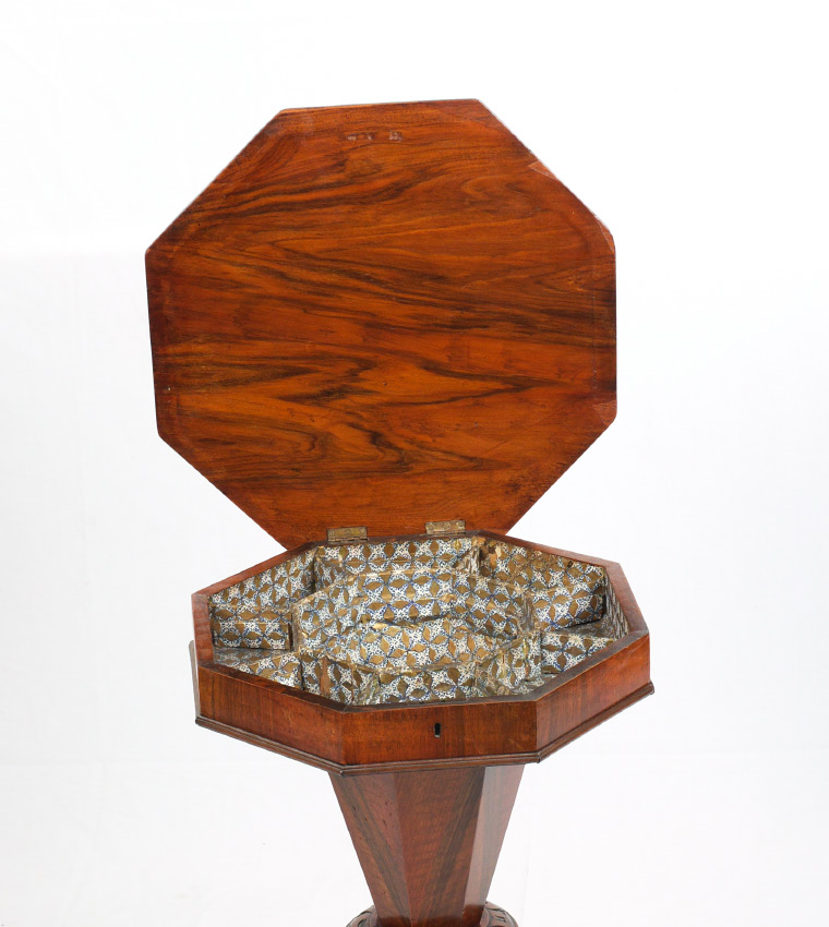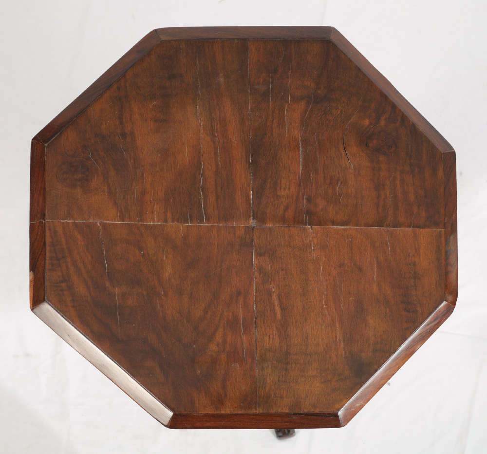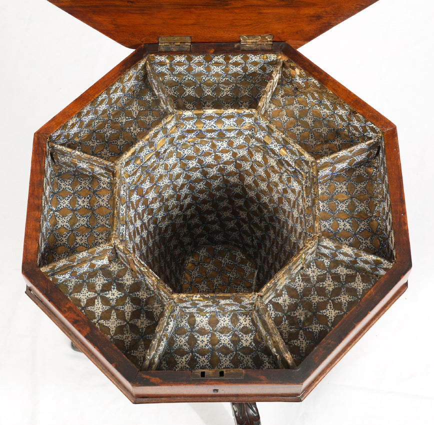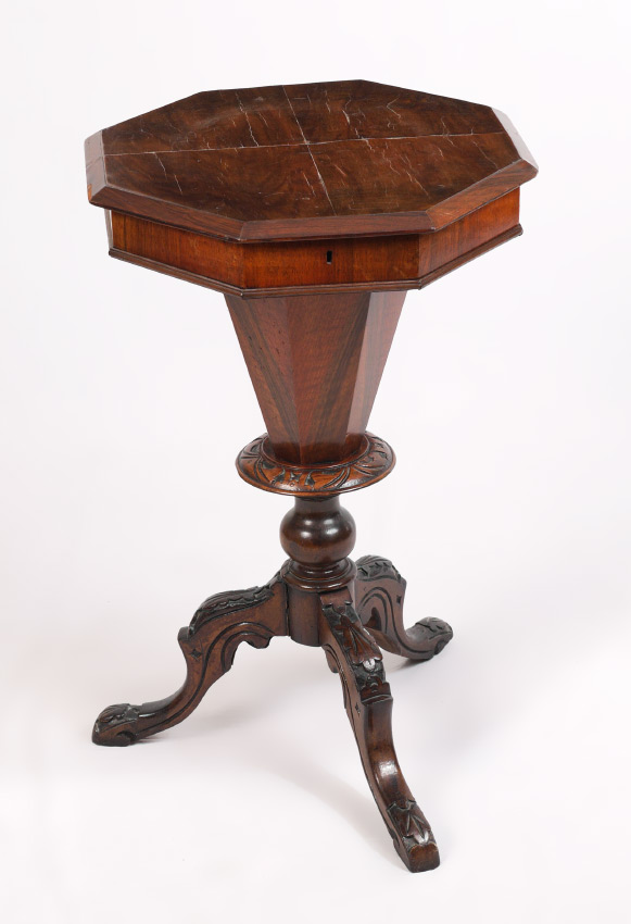 ROSEWOOD VENEER VICTORIAN SEWING STAND: Octagonal hinged lid opens to compartmented interior, tapered support, carved base with 3 splayed carved legs, 28 1/4'' h. x 17 1/2''.