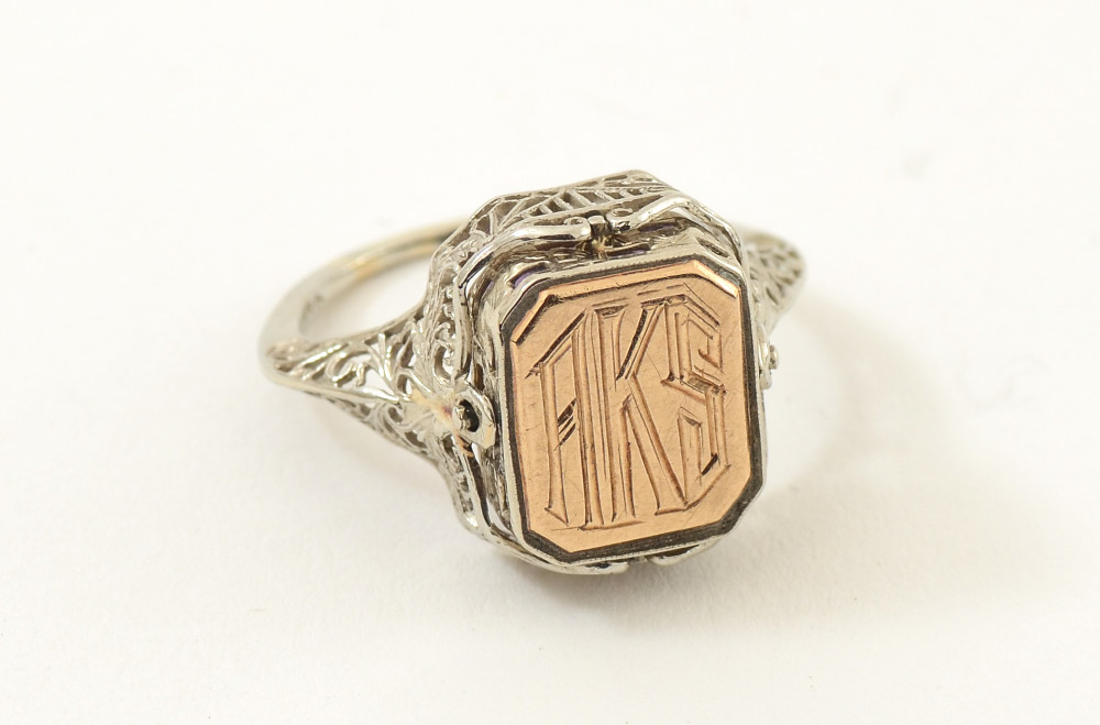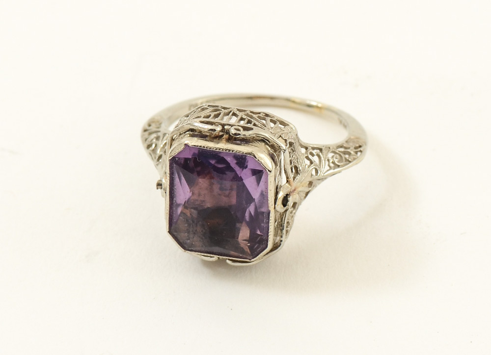 UNIQUE 14K AMETHYST ''FLIP'' RING: 14K white gold ring features 3.00 CT scissor cut amethyst that flips to a yellow gold plate surface with a monogram AKS. Size 7.75. Total weight 4.4 grams.