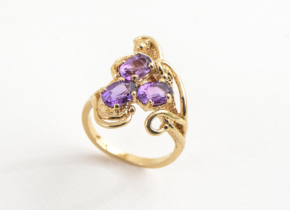14K FREE FORM AMETHYST RING: 3 natural oval cut amethysts are set into a lovely free form design. Designer marked and 14K mark. Size 5.5. Weight 4.8 grams.