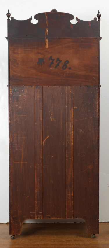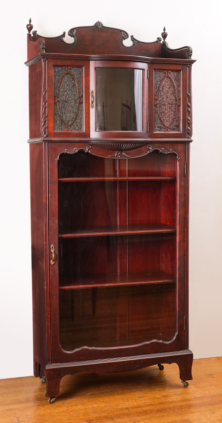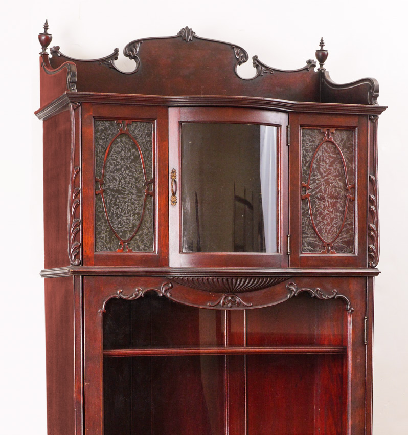 VICTORIAN MAHOGANY ETAGERE DISPLAY CABINET: Top with carved and shaped gallery, urn finial, 3 glass doors over single large glass doors. Center top glass door bowed, side doors with etched glass and filigree. Large glass door with 3 internal shelves, shaped skirt, all on castors. Overall measures 72 1/2'' h. x 30 1/2'' x 15 3/4''.