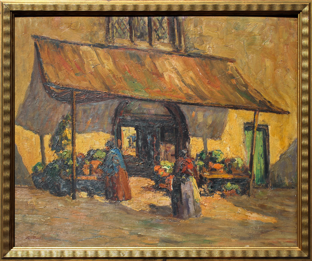 TURLAND, George, (English, 1877-1947): Market Scene, Oil/Board, 20'' x 24'', signed lower left, framed, 22'' x 26''. George Turland Goosey designed several important buildings in America and was an accomplished etcher. In 1921, he returned to England to try his hand at painting and settled in the St Ives art colony. He developed an impressionistic style in oils and his paintings are much admired for their quality.