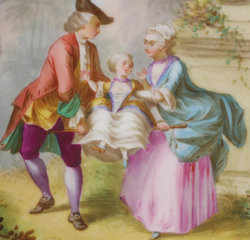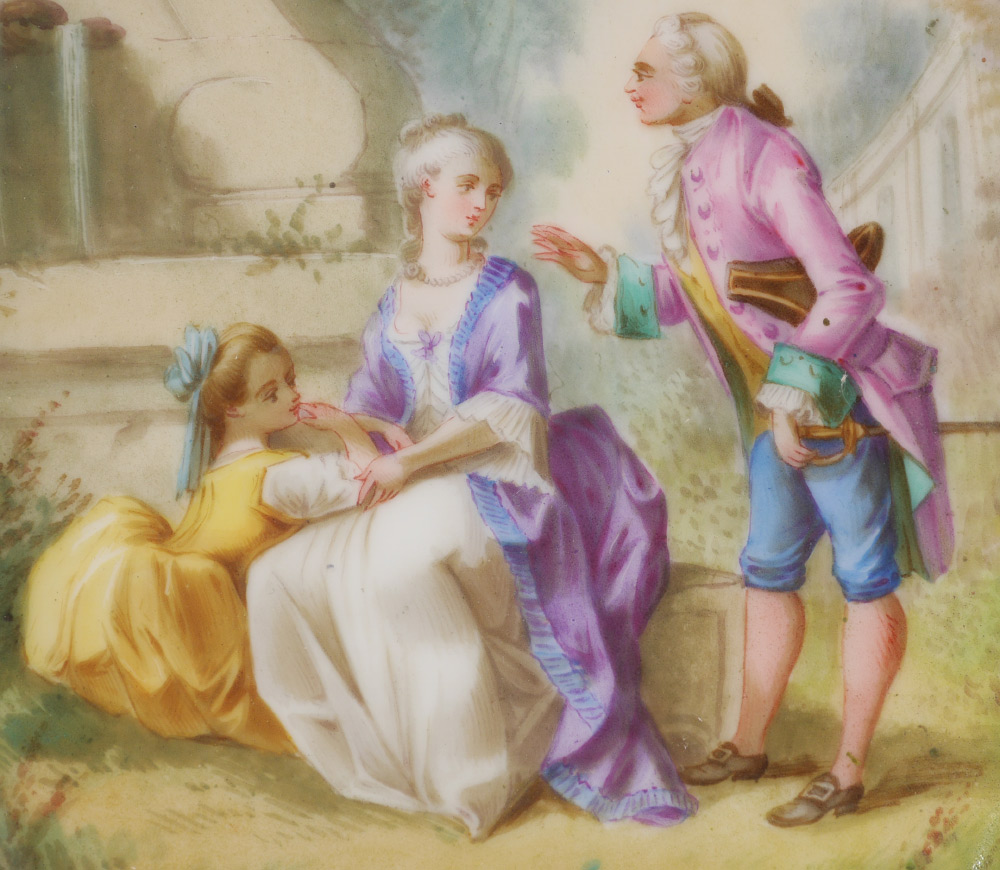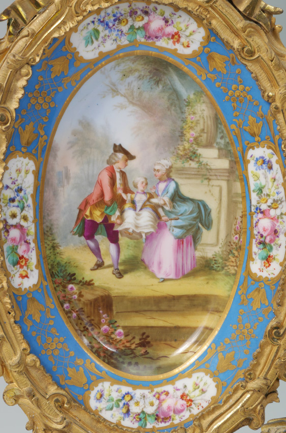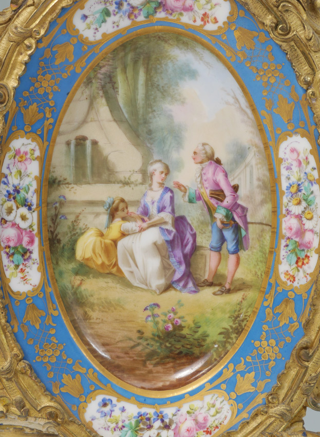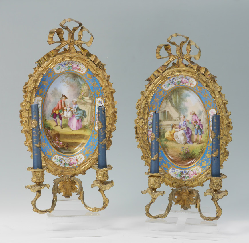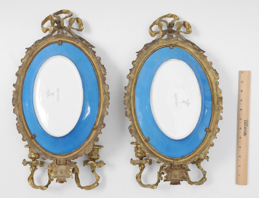 PAIR SEVRES STYLE PORCELAIN MOUNTED SCONCES: Hand painted oval porcelain plaques with genre scene center and floral decoration, gilt metal frames with ribbon finial, 2 arms each. Sevres style mark on back, overall measures 18'' x 10'' x 6''.