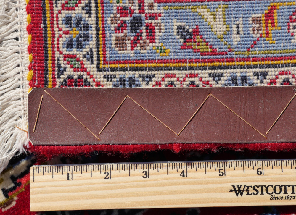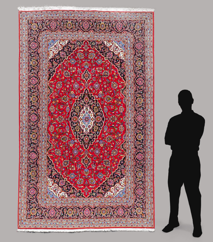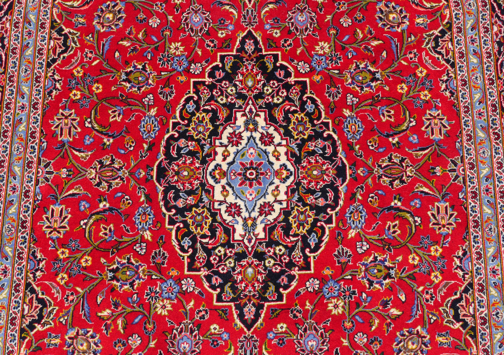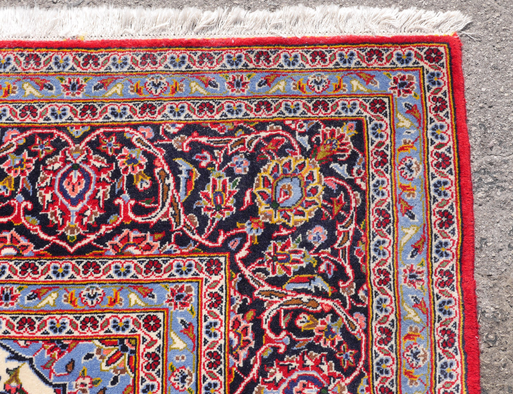 APPROX. 20-35 YR OLD INDO-PERSIAN HAND KNOTTED WOOL RUG, 6'8'' X 9'10'': The blue, white, then black central medallion rests on a red field. The corners have a repeat of the colors in the medallion. The field is further covered with flowers, leaves, and palmettes linked by vines. The pale blue guard borders on either side of the black ground main border complete the rug.