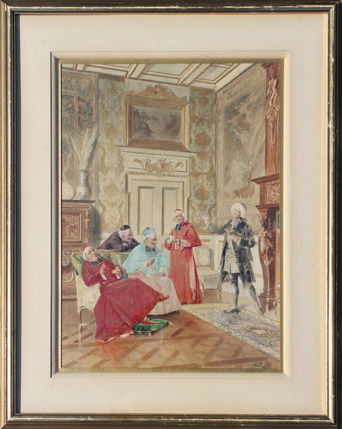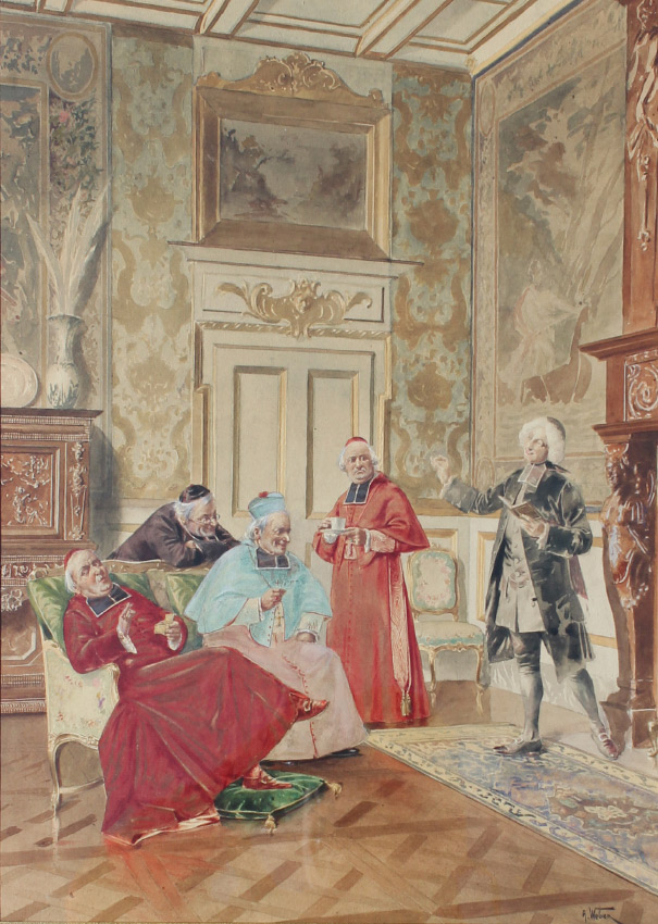 WEBER, Alfred Charles, (French, 1862-1922): ''Divine Entertainment'', Interior Genre Scene with the Pope and Religious Members, sight size 19'' x 13.75'', framed 27'' x 22'', signed lower right.