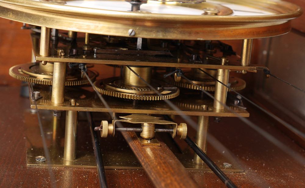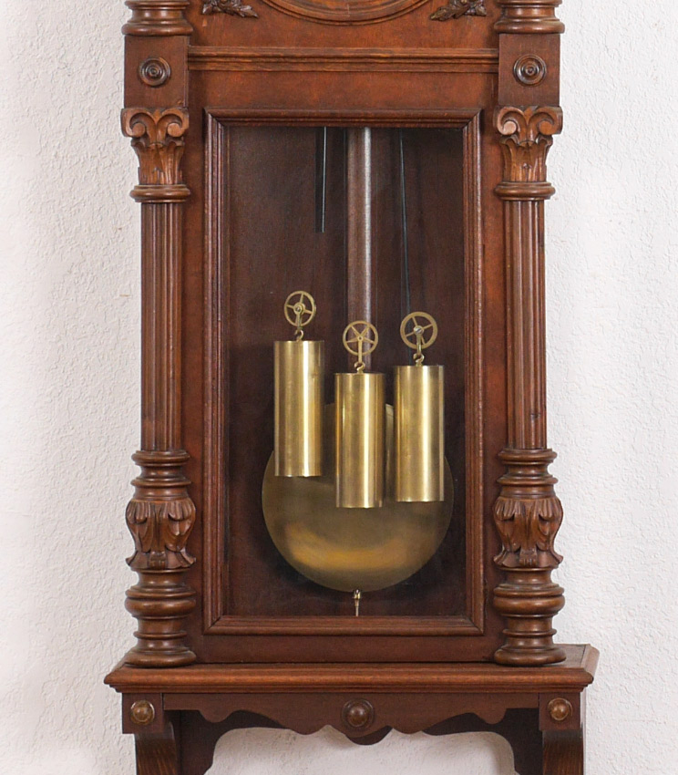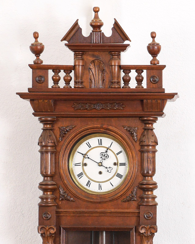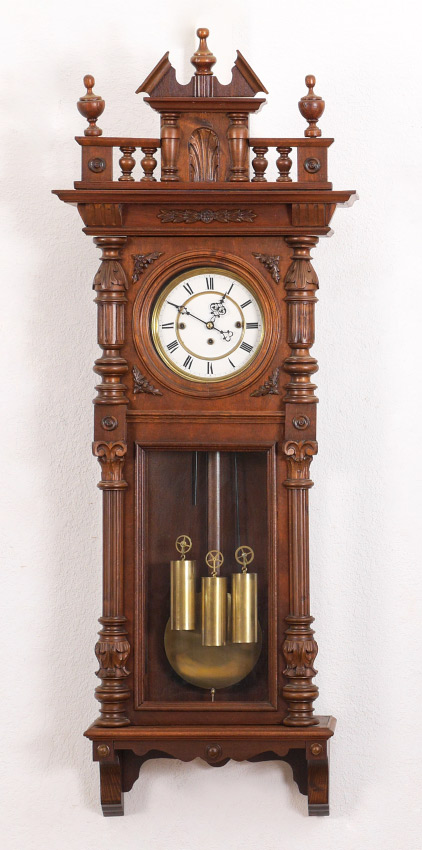 GERMAN WALNUT TRIPLE WEIGHT REGULATOR CLOCK: Removable architectural pediment with urn finials, door with carved and fluted half columns. Enameled dial with Roman numerals, Gebruder Resch triple weight time and strike movement, overall measures approx. 48'' h. x 18 1/2'' x 7 1/2''.