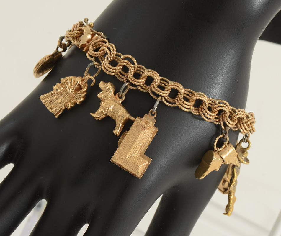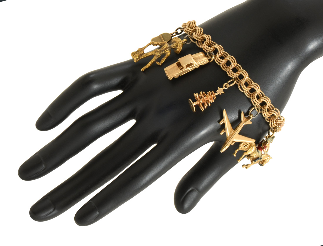 55.5 GRAM 14K GOLD CHARM BRACELET: 11 gold charms adorn this 7.5'' charm bracelet. You can attach your own charm where one appears to be missing. Charms are attached to a triple circle link bracelet. Total weight 55.5 grams.