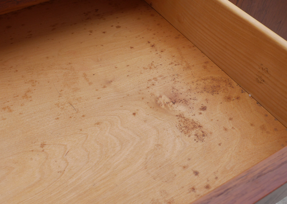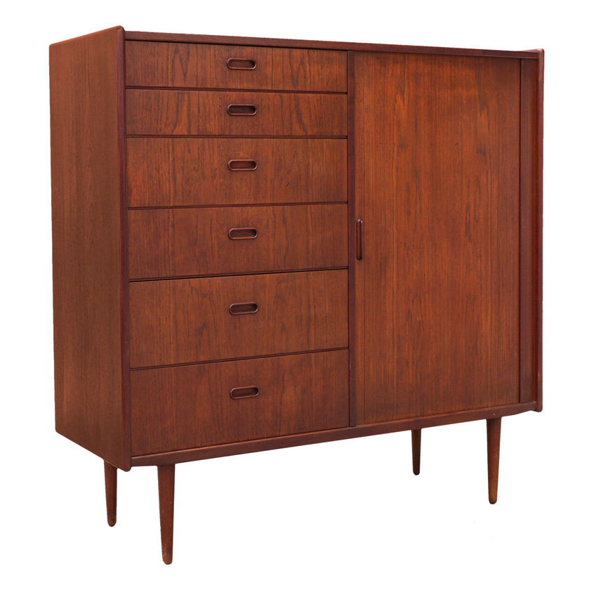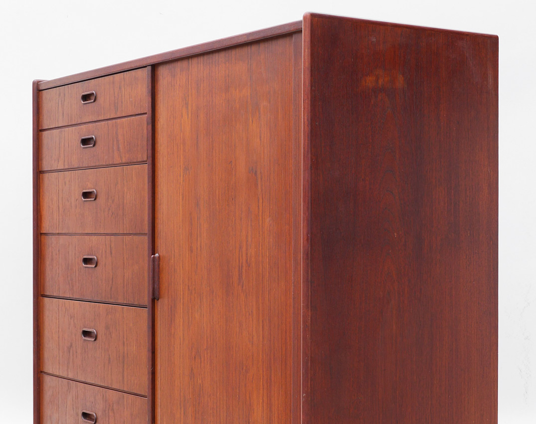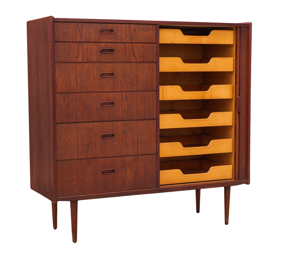 DANISH BORGE MORGENSEN FOR SOBERG MOBLER TEAK CHEST: Left side with 6 graduating drawers with integrated wood pulls, right side with tambour door and 6 sliding drawers. Turned legs, overall 47 1/2'' h. x 48'' x 18 1/4''.