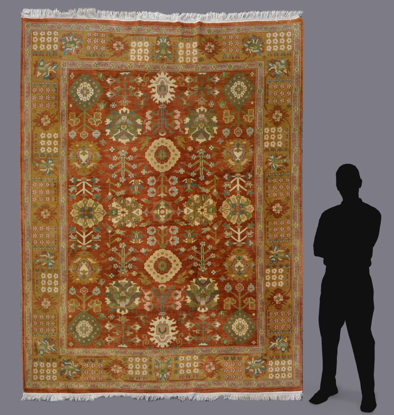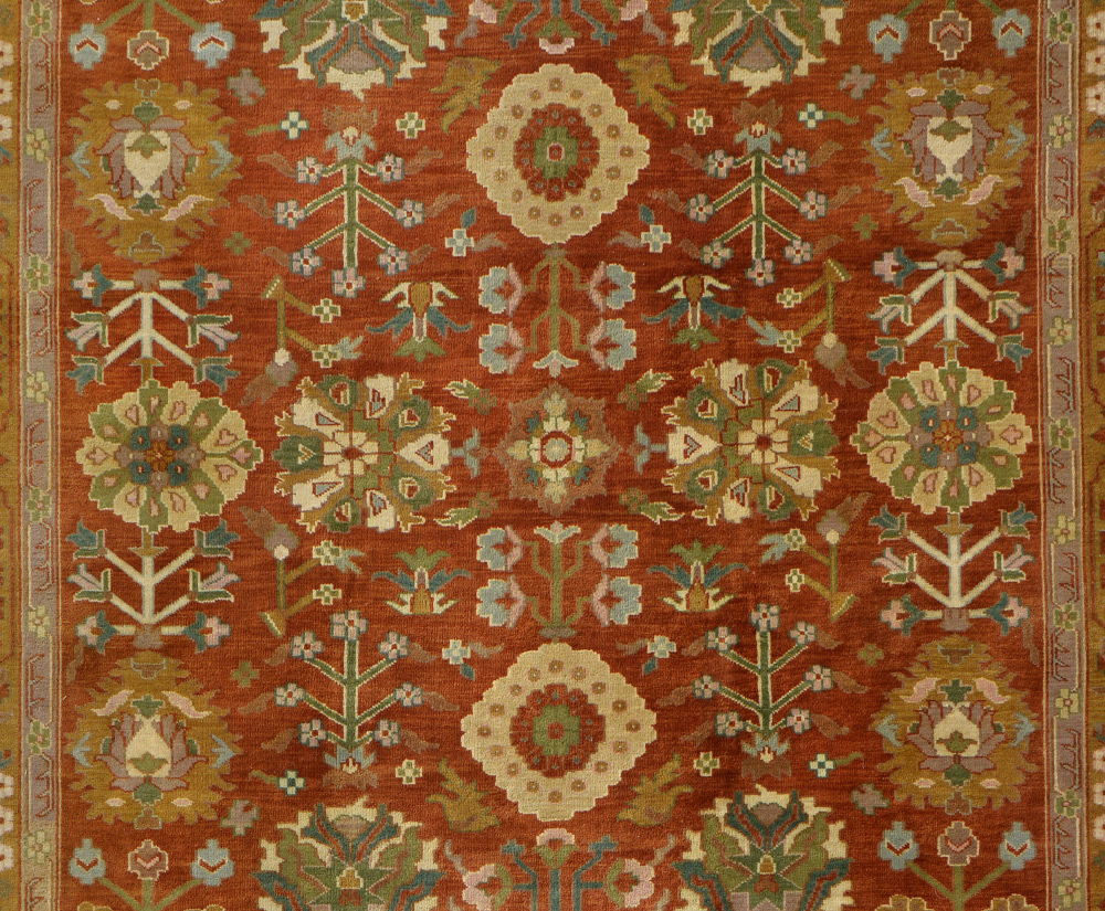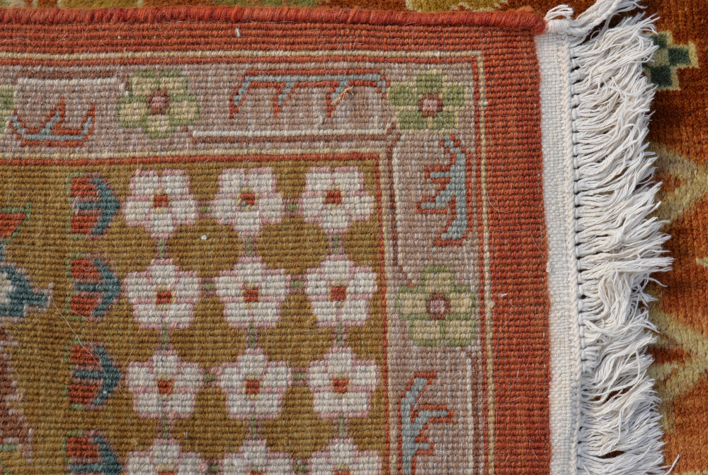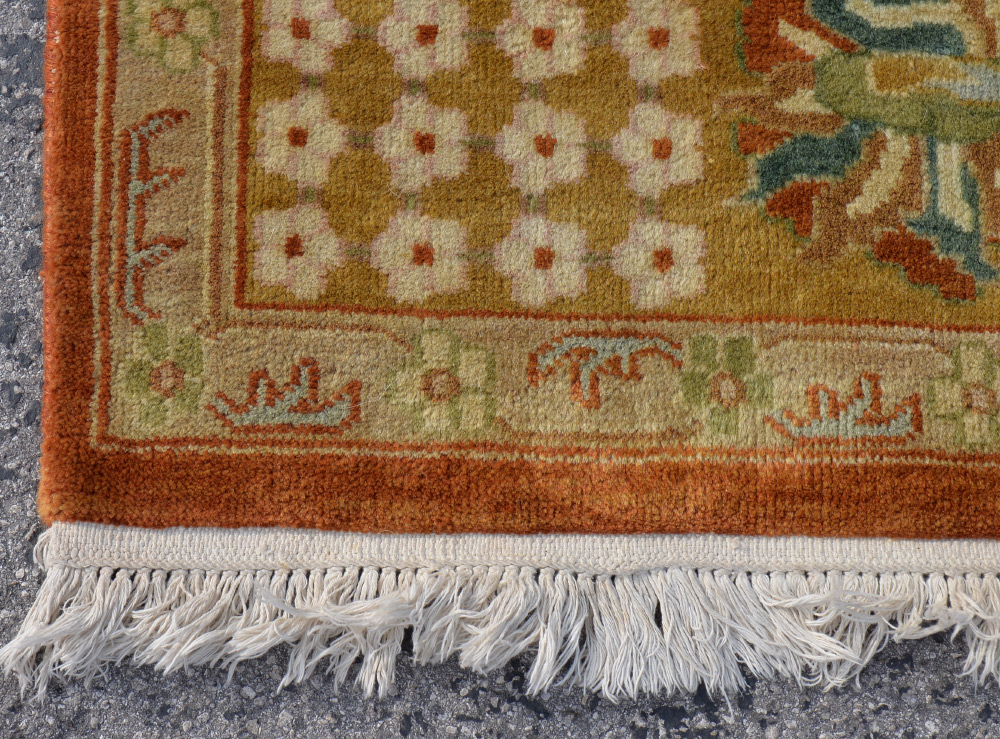 APPROX. 15-30 YR OLD INDO-PERSIAN HAND KNOTTED WOOL RUG, 8' X 9'10'': This rugs main design is a variant on a ''Mina Khani'' traditional Persian design. Large flower heads or palmettes alternate with trees that look like they are sprouting from the flowerheads below them. The red/rust ground and the gold main border have motifs in ivory, gold, beige, green, and blue.