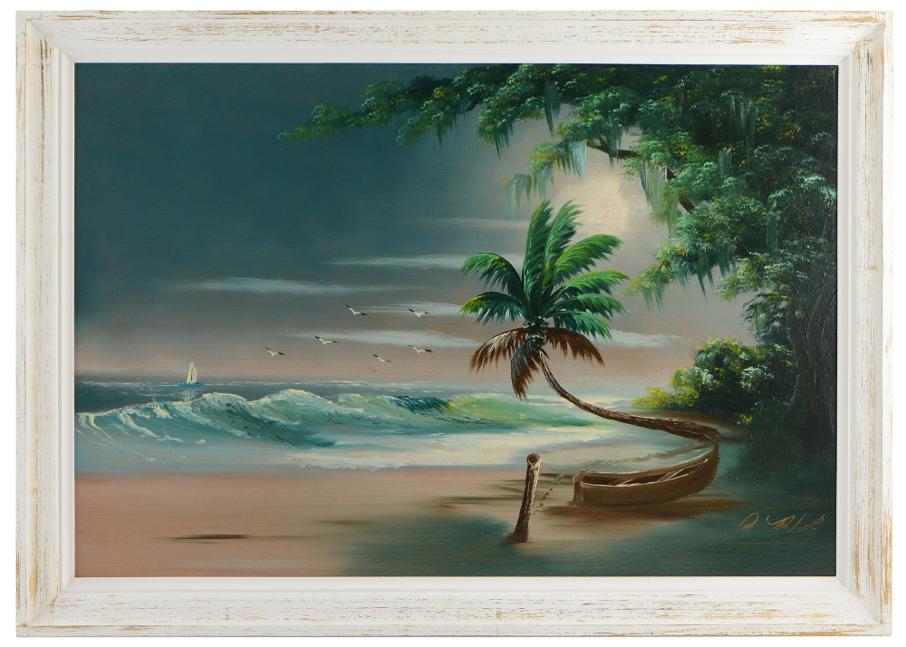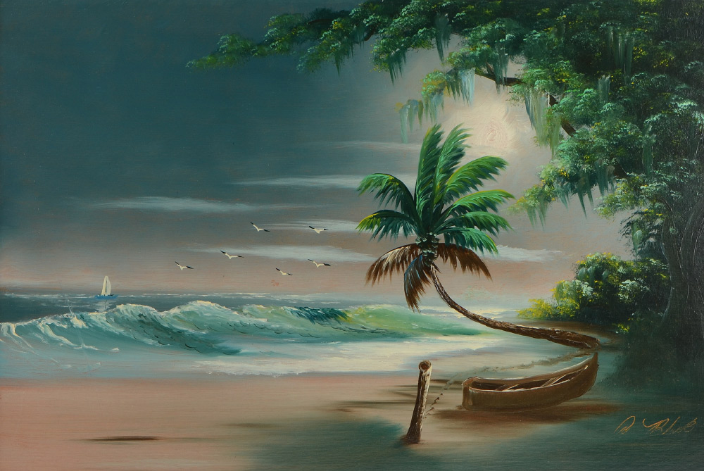 BLACK, Al ''Blood'', (American, 20th Century): Florida Highwaymen nocturnal lagoon scene with trees, boats and birds, Oil/Upson, signed lower right, 24'' x 36'', framed 27 3/4'' x 39 3/4''. Al Black is the most notorious of the Florida Highwaymen artist, spending time in prison and creating murals on the prison walls.