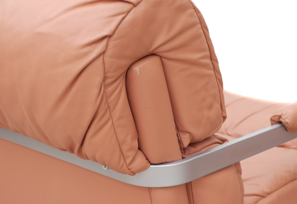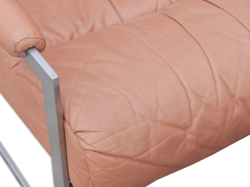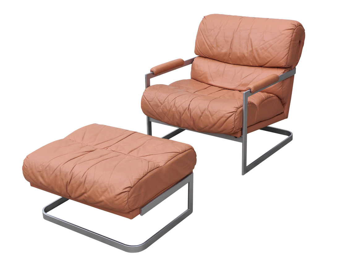 MID-CENTURY MILO BAUGHMAN STYLE CHAIR AND OTTOMAN: Bent steel frames, pink leather upholstery, unmarked. Chair measures 32 1/4'' h. x 38'' x 31 1/2''. ottoman 16'' x 29'' x 21 1/2''.