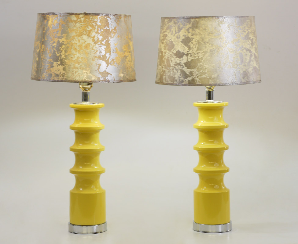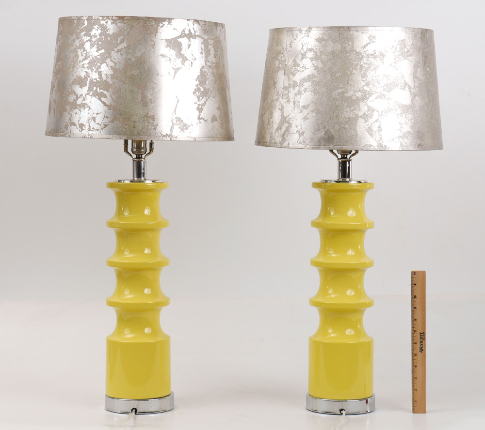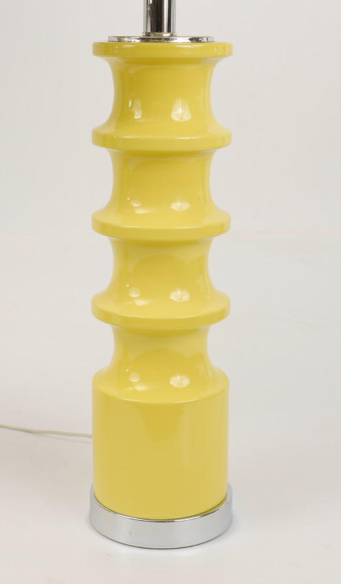 PAIR OF MID-CENTURY MODERN YELLOW LAMPS WITH SHADES: Shaped ceramic bodies, chrome base and top, single socket, no label or marks. Overall measures 32 3/4'' h. x 5 1/2'', sold with shades 10 1/4'' h. x 16 1/4''.