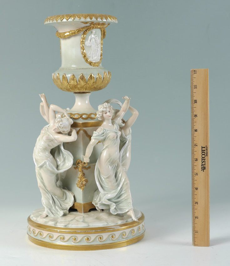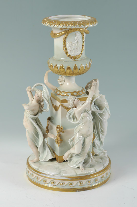 DRESDEN PORCELAIN FIGURAL CENTERPIECE: Early 20th century with Dresden Art Publishers mark, 4 figural maidens on each side of an urn on pedestal. Overall measures 16 1/4'' h. x 9 3/4'' dia.