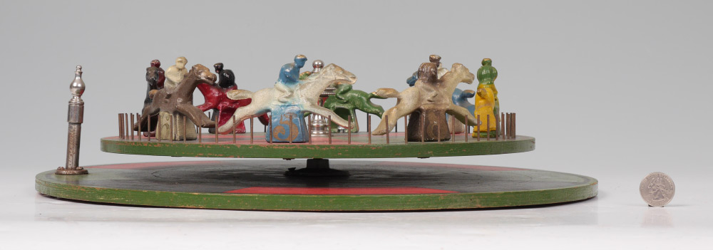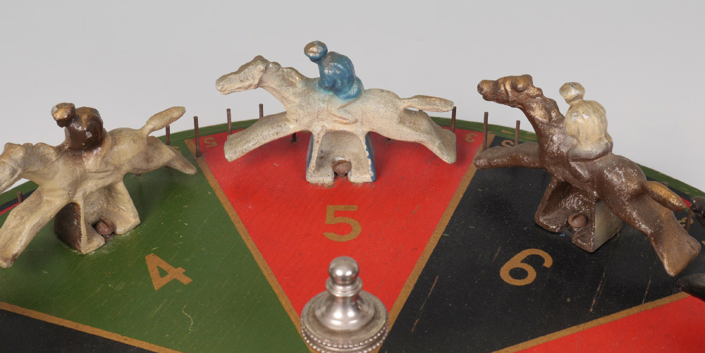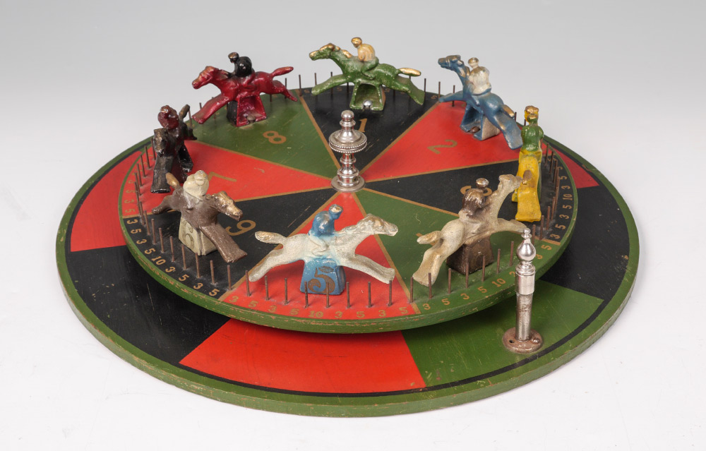 SPINNING HORSE RACE GAME WHEEL GAME: 8 painted metal horses on spinning wheel gambling game. Top wheel spins, metal post to side to indicate winner and points awarded, post missing point to slow and indicate points on metal pegs. No markings, overall 4'' h. x 17 1/4''.