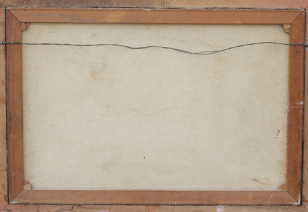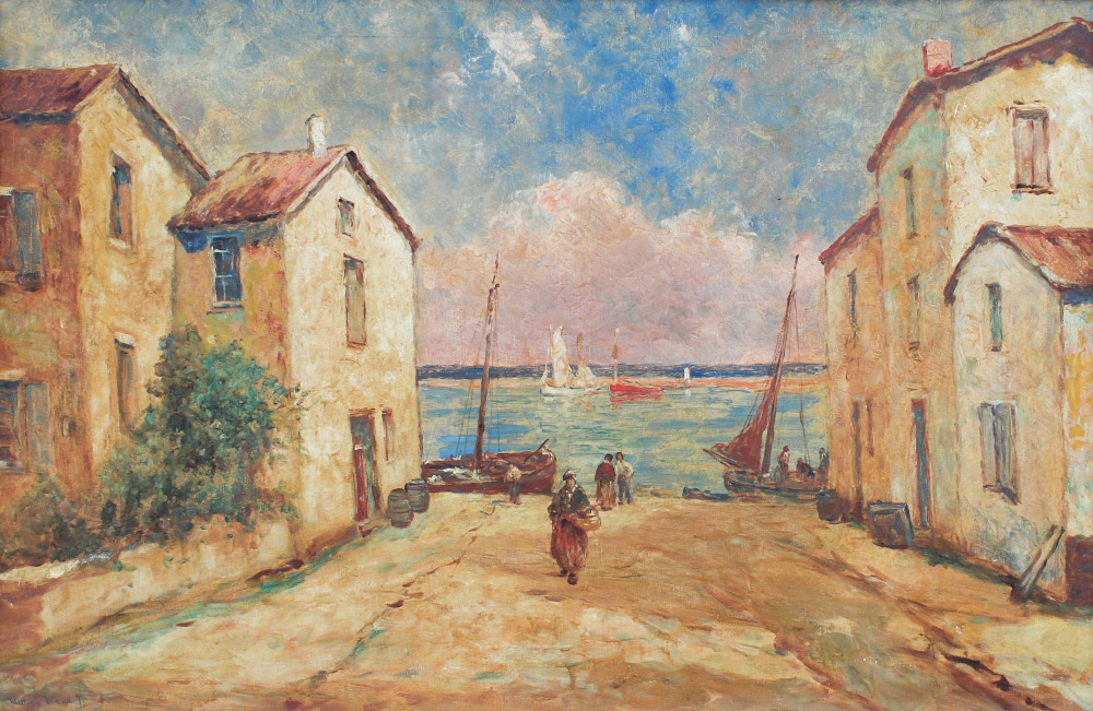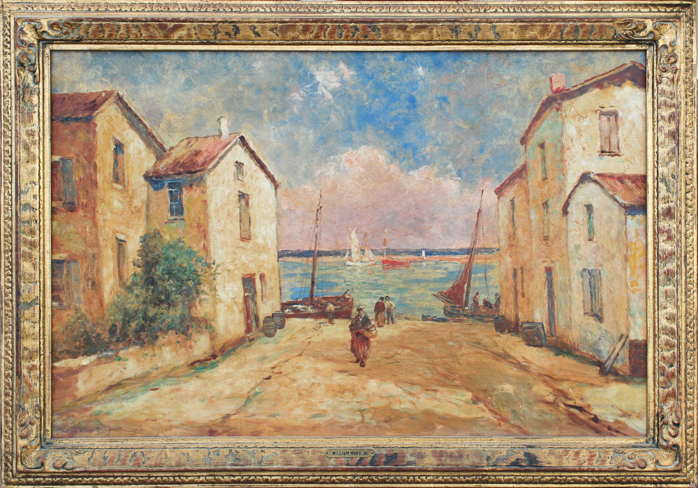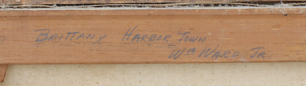 AMUNDSEN, C. Hjalmar, (American, 1911-2001): ''Brittany Harbor Town'', Oil/Canvas, 24'' x 36'', signed lower left William Ward Jr, one of the artist's pseudonyms, titled on stretcher verso, period carved and gilded gesso frame, 29.5'' x 41.5''.