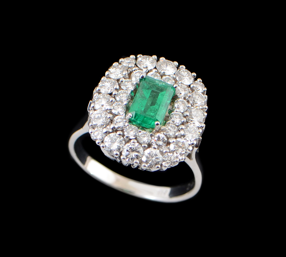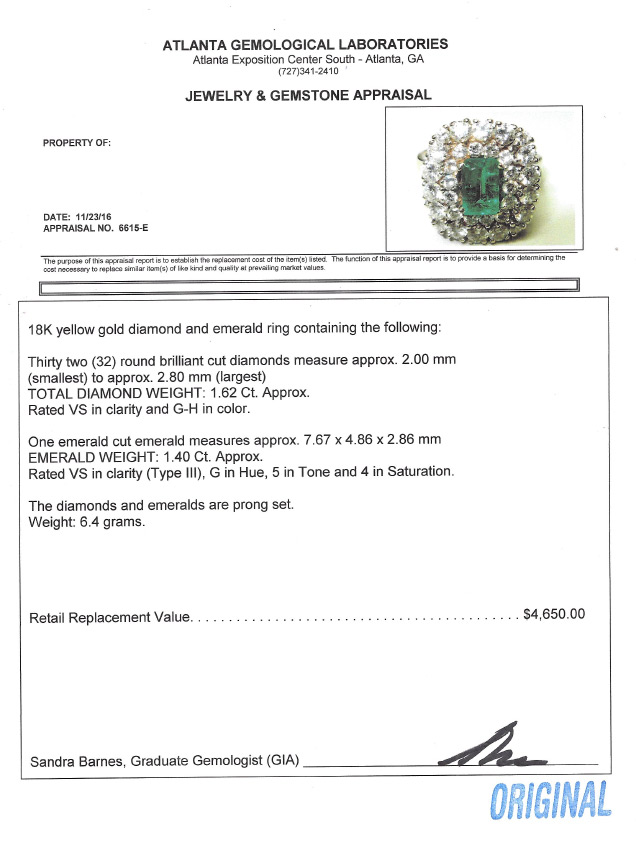 3.02CTW EMERALD & DIAMOND POWER RING: 1.40CT Colombian emerald is beautifully nested amid 1.62CTW of fine round brilliant cut diamonds. Size 7. Sold with current Atlanta Gemological GIA graduate's appraisal for $4650.