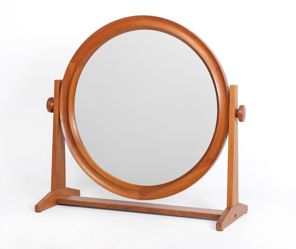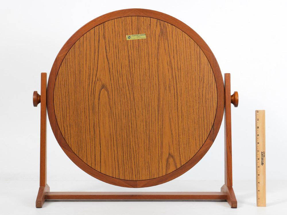JORGES PEDERSEN MID-CENTURY ROUND MIRROR ON STAND: Pederson & Hansen labeled table top oval swivel mirror on stand, measures 25 1/2'' h. x 26 3/4'' x 11 1/4''.